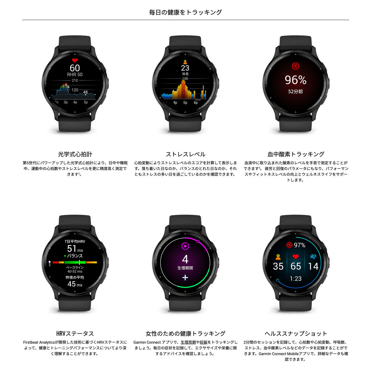 心身の状態とパフォーマンスのベースモニタリングとなる光学式心拍計が、Garmin史上最高の精度を誇る第5世代に進化。進化したBody Battery機能をはじめ、フィットネス年齢や 3つの新たな睡眠サポート機能など、一層充実したヘルス&ウェルネス機能で、よりパーソナライズされた健康アドバイスやフィットネス提案が可能。通話発信や応答、音声アシスタントによるテキストメッセージへの返信やスマートホームデバイスの制御にも対応しています。ビジネスシーンからカジュアルスタイルやスポーツまで、シーンを選ばず着用できるプレミアムなフィットネスGPSウォッチです。