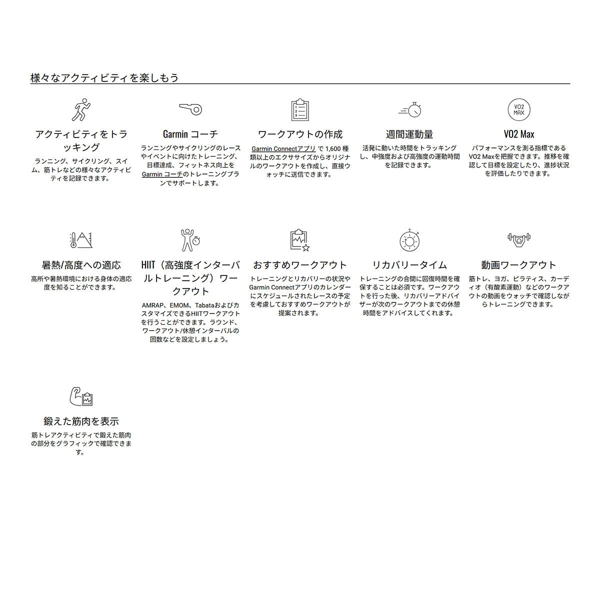 | ■ディスプレイ:1.2インチ ■解像度:390×390ピクセル ■ディスプレイタイプ:高精細AMOLEDディスプレイ ■内蔵メモリ:4GB ■稼働時間 ・スマートウォッチモード:約14日間 ・バッテリー節約ウォッチモード:約18日間 ・GPS+光学心拍計モード:約29時間 ・マルチGNSSモード:約18時間 ・マルチGNSSマルチバンドモード※1:約15時間 ・バッテリー最長GPS モード:約53時間 ・エクスペディションモード:約12日間 ■防水等級※2:10ATM(100m) ■無線インターフェイス:Bluetooth、ANT+ ■衛星測位:GNSSマルチバンド&SatIQ、GPS/GLONASS/Galileo/みちびき(補完信号) ■MIL-STD-810:○ ■LEDフラッシュライト:○ ■センサー:光学式心拍計、電子コンパス、気圧高度計、加速度計、温度計、血中酸素トラッキング ■SatIQ:○ ■レッドシフトモード:○ ■ライフログ機能:ステップ数、呼吸数、血中酸素トラッキング※3、睡眠スコア、消費カロリー、週間運動量、ストレスレベル、Body Battery、生理周期、妊娠トラッキングなど ※生理周期、妊娠トラッキングは女性ユーザーのみ使用できます。 ■お昼寝検出&睡眠コーチ:○ ■対応アクティビティ:ランニング、サイクリング、釣り、水泳、登山、スキー、スノーボード、筋力トレーニング、クライミング、クロスカントリースキー、バーチャルランニング、ヨガ、ピラティス、ゴルフ、HIITなど90種類以上 ■ワークアウト動画:○ ■Garminシェア/Messenger App:○ ■その他機能:通知機能、Suica※4、Garmin Pay、天気情報、事故・転倒検出機能、スマホ探索など ※1 SatIQ使用想定 ※2 防水規格については、GARMIN公式サイトをご覧ください。 ※3 血中酸素トラッキングは自己診断又は医師への相談をはじめとする医学的な使用を意図するものではなく、疾病の治療・診断・予防を目的とした医療機器ではありません。 ※4 Suicaは東日本旅客鉄道株式会社の登録商標です。 |