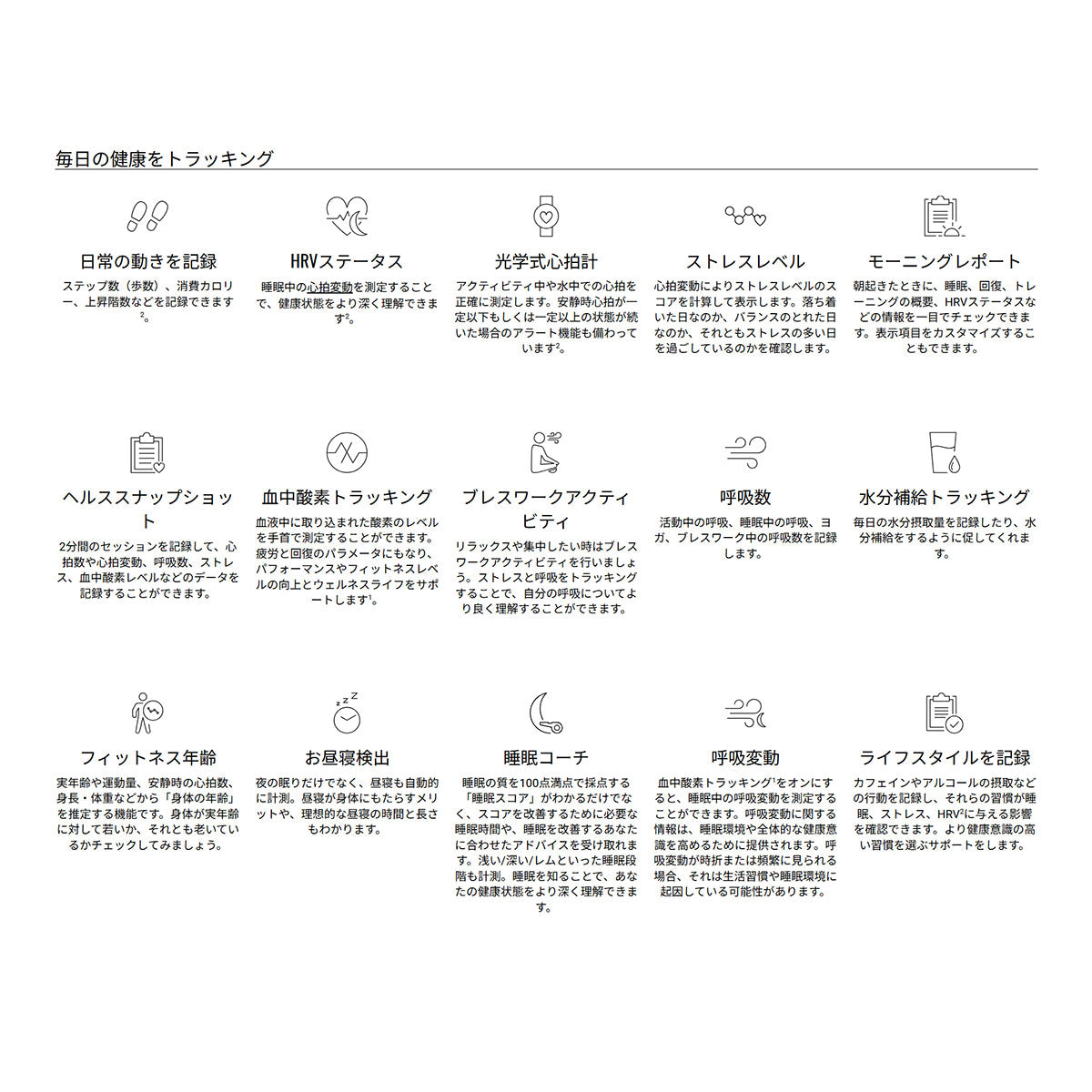 | ■ディスプレイ:1.2インチ ■解像度:390×390ピクセル ■ディスプレイタイプ:高精細AMOLEDディスプレイ ■内蔵メモリ:4GB ■稼働時間 ・スマートウォッチモード:約14日間 ・バッテリー節約ウォッチモード:約18日間 ・GPS+光学心拍計モード:約29時間 ・マルチGNSSモード:約18時間 ・マルチGNSSマルチバンドモード※1:約15時間 ・バッテリー最長GPS モード:約53時間 ・エクスペディションモード:約12日間 ■防水等級※2:10ATM(100m) ■無線インターフェイス:Bluetooth、ANT+ ■衛星測位:GNSSマルチバンド&SatIQ、GPS/GLONASS/Galileo/みちびき(補完信号) ■MIL-STD-810:○ ■LEDフラッシュライト:○ ■センサー:光学式心拍計、電子コンパス、気圧高度計、加速度計、温度計、血中酸素トラッキング ■SatIQ:○ ■レッドシフトモード:○ ■ライフログ機能:ステップ数、呼吸数、血中酸素トラッキング※3、睡眠スコア、消費カロリー、週間運動量、ストレスレベル、Body Battery、生理周期、妊娠トラッキングなど ※生理周期、妊娠トラッキングは女性ユーザーのみ使用できます。 ■お昼寝検出&睡眠コーチ:○ ■対応アクティビティ:ランニング、サイクリング、釣り、水泳、登山、スキー、スノーボード、筋力トレーニング、クライミング、クロスカントリースキー、バーチャルランニング、ヨガ、ピラティス、ゴルフ、HIITなど90種類以上 ■ワークアウト動画:○ ■Garminシェア/Messenger App:○ ■その他機能:通知機能、Suica※4、Garmin Pay、天気情報、事故・転倒検出機能、スマホ探索など ※1 SatIQ使用想定 ※2 防水規格については、GARMIN公式サイトをご覧ください。 ※3 血中酸素トラッキングは自己診断又は医師への相談をはじめとする医学的な使用を意図するものではなく、疾病の治療・診断・予防を目的とした医療機器ではありません。 ※4 Suicaは東日本旅客鉄道株式会社の登録商標です。 |