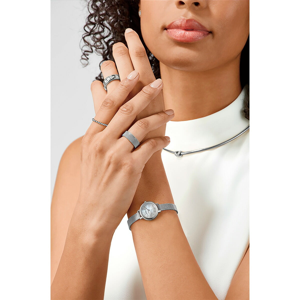 シンプルな定番カラー“SILVER×PEARL” 肌馴染みのよいカラーで人気のシルバー。アクセサリーのように腕元のワンポイントとしても映えます。