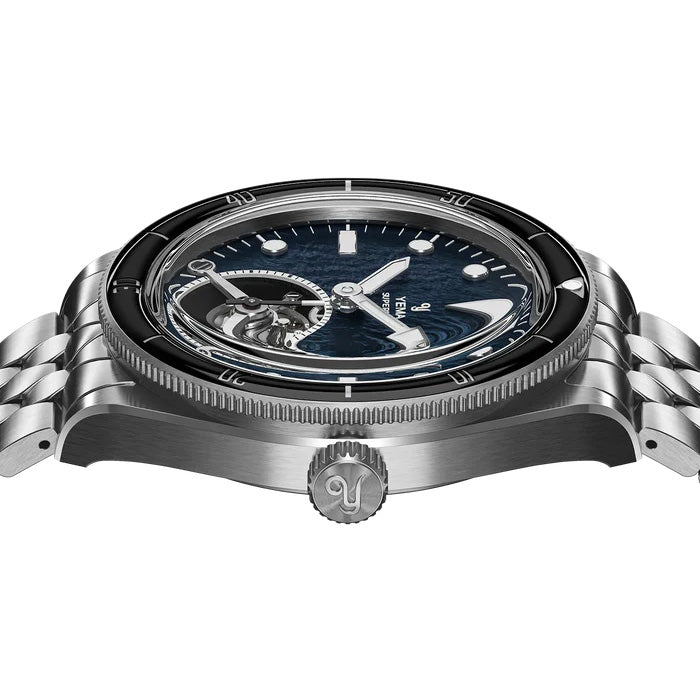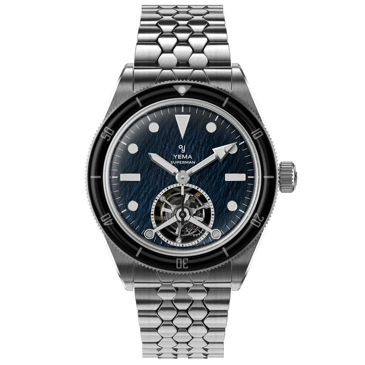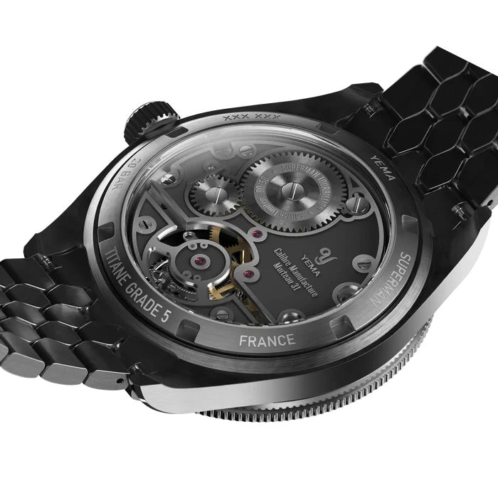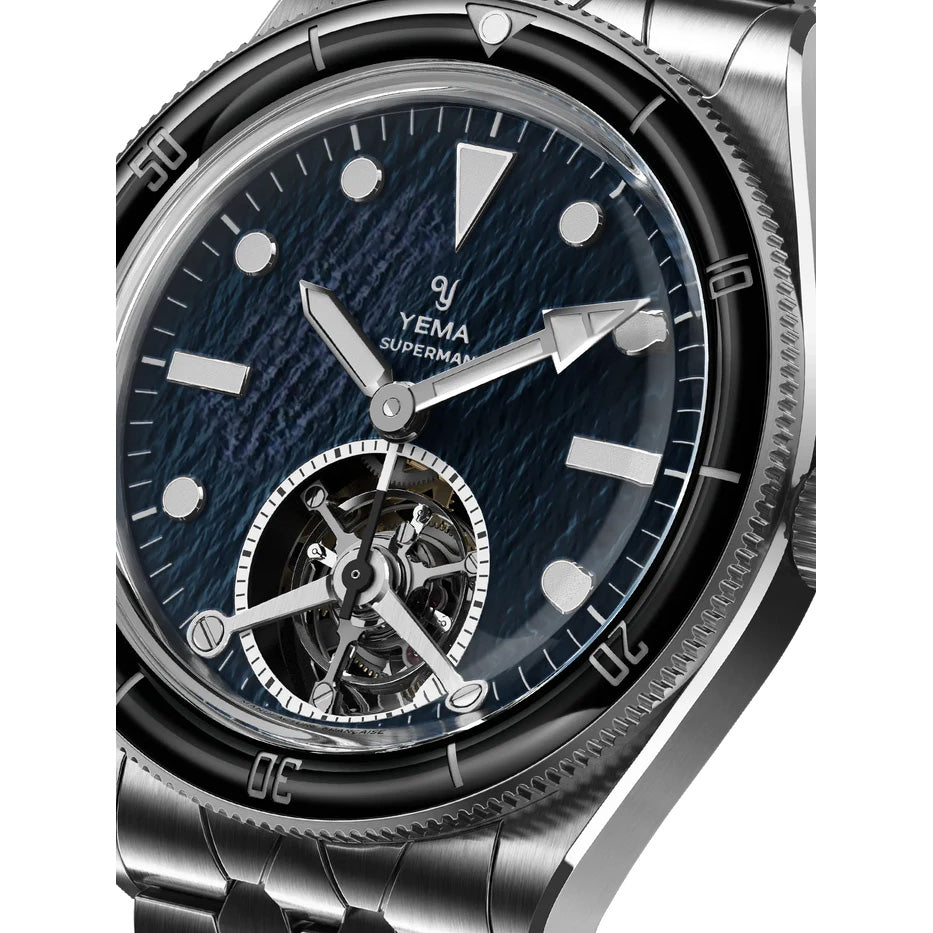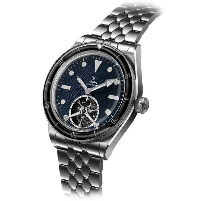 初回エディションの即時完売という圧倒的な成功を受け、YEMAはその最も卓越したクリエーションに新たな解釈を加えました。Superman Tourbillon CMM.31は、YEMAの時計製造技術と自社開発能力の頂点を示すものであり、ウルトラ・リミテッド・シリーズとして生産されるプレミアムなハンドメイド作品です。フランス時計製造の伝統と、絶え間ない卓越性への追求を体現しています。ブランドの最も象徴的なモデルである1963年に誕生したプロフェッショナルダイバーズウォッチ「YEMA Superman」を再解釈し、本エディションでは自社製トゥールビヨン・キャリバーを搭載。技術革新、オート・オルロジュリーの仕上げ、そして堅牢なツールウォッチとしての性能を融合させています。世界でわずか50本のみの製造で、1本ずつ個別にナンバリングされています。