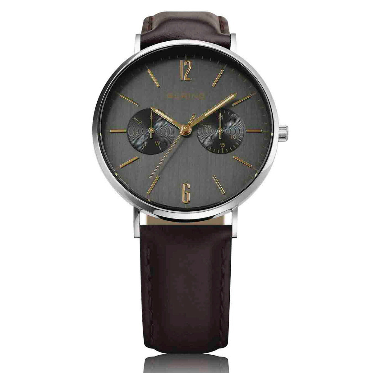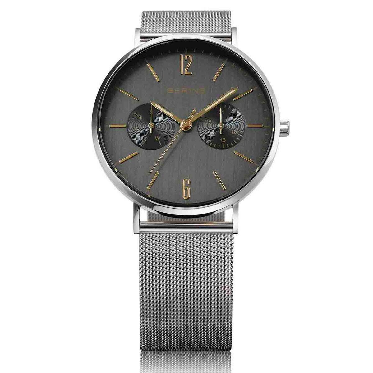 高級感を演出した日本別注カラー“Changes”BERINGで最も人気のシリーズ「Changes」から、ブランドの2022AWシーズンのキーカラー「スレートグレイ×イエローゴールド」を纏った新色が日本限定で登場です。ヘアライン加工を施し金属の表面のような美しい質感のダイヤルに、ゴールドの針とインデックスのコンビが高級感と落ち着いた雰囲気を演出します。爽やかな印象のシルバーメッシュはどんな服装にも合わせやすい万能な1本に、ダークブラウンレザーは深みのある大人な印象の1本に。