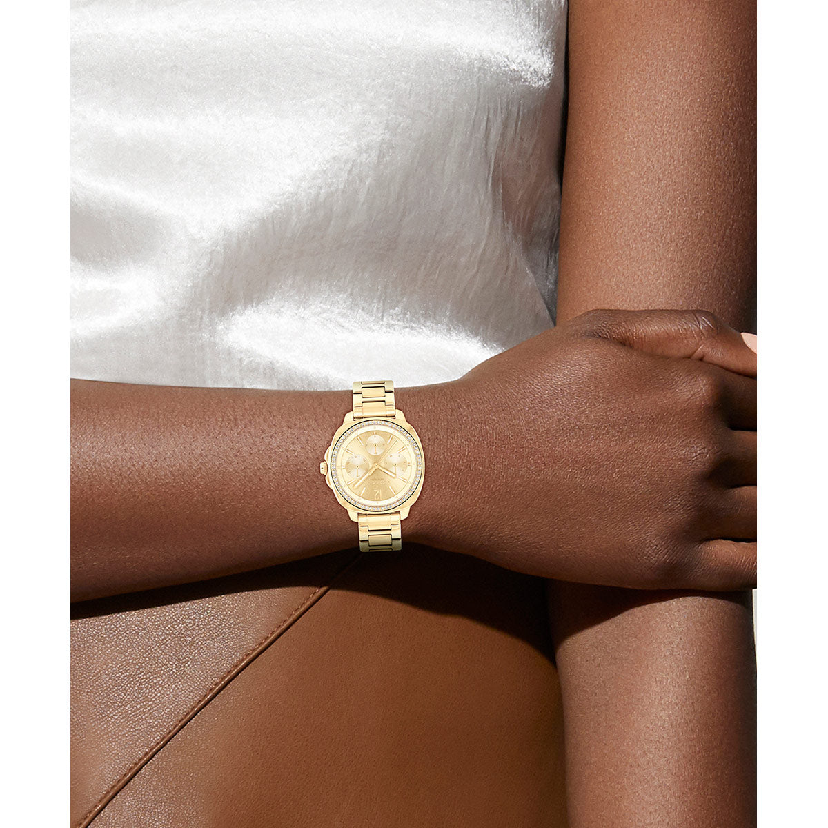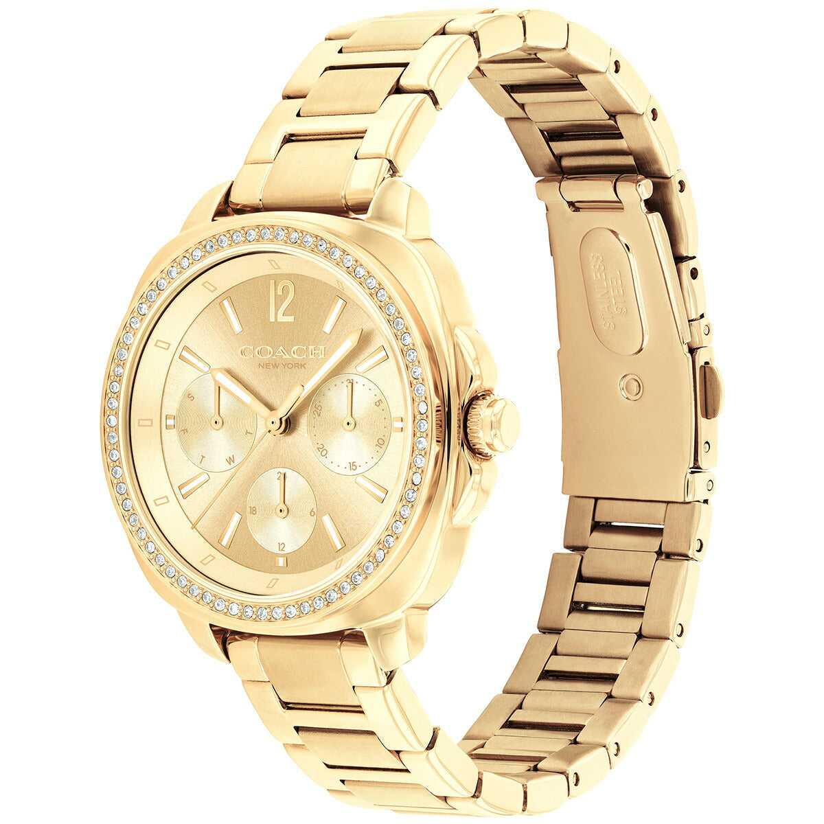 モダンなスタイルが魅力のキット ウォッチ。ビジネスからプライベートまで活躍する、ブレスレットを合わせたステンレススチールの腕時計です。数字マーカーとポリッシュ仕上げのスティックマーカーを組み合わせたサンレイ文字盤に、3つのサブダイヤル(日付・曜日・24時間表示)付き。ベゼルに埋め込まれたクリスタルが美しい輝きを放ちます。