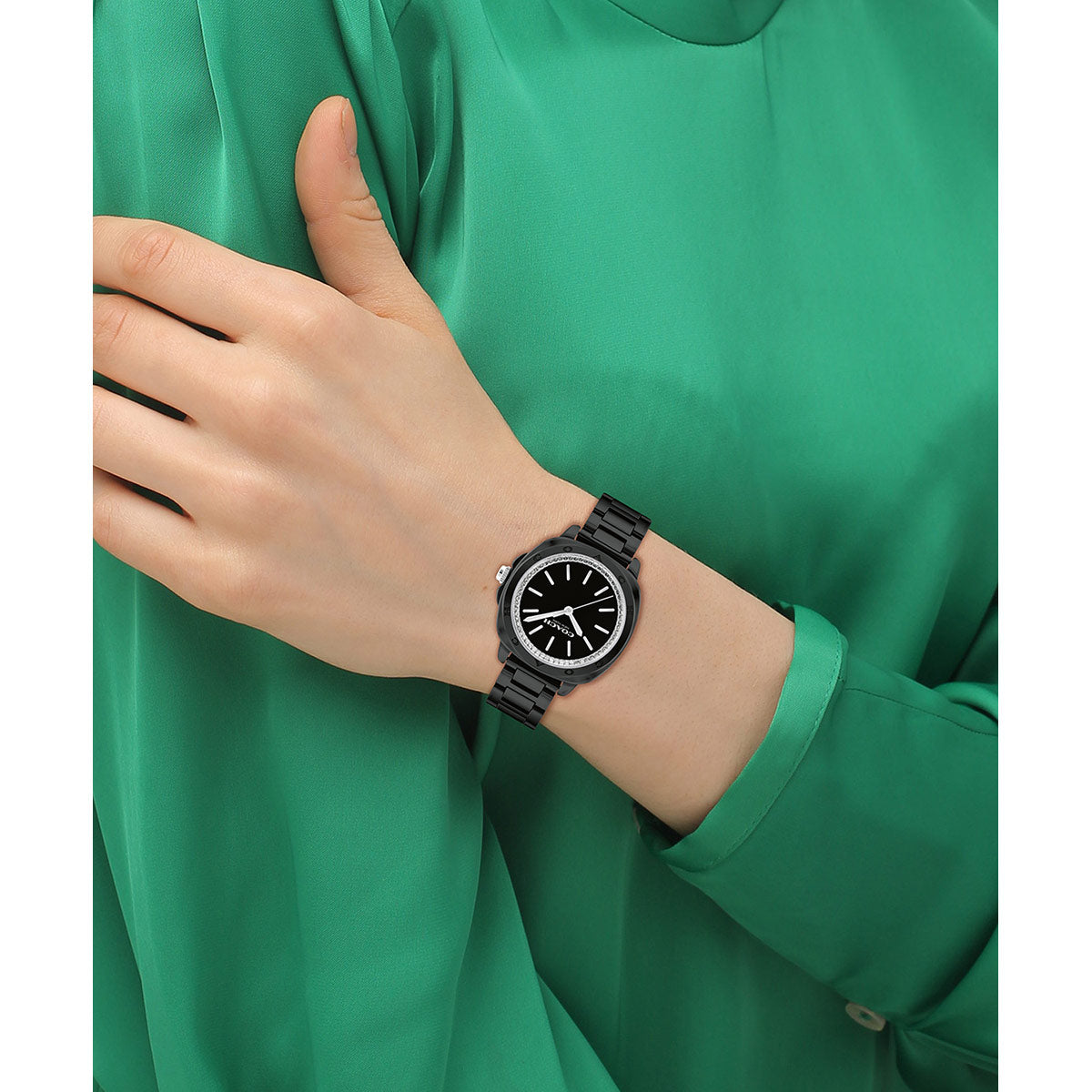 モダンなスタイルの Kitt は、オン・オフ問わず使用できるデザイン。クリスタルベゼルがきらめくこのセラミックブレスレットデザインは、立体的なトーンのスティック マーカーとスイープ秒針で装飾されたラッカーダイヤルが特徴です。