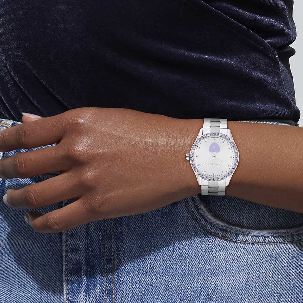 6時位置で踊るようにクルクルと廻るハートのモチーフがユーモラス。ベゼルのカラーストーンが華やかです。