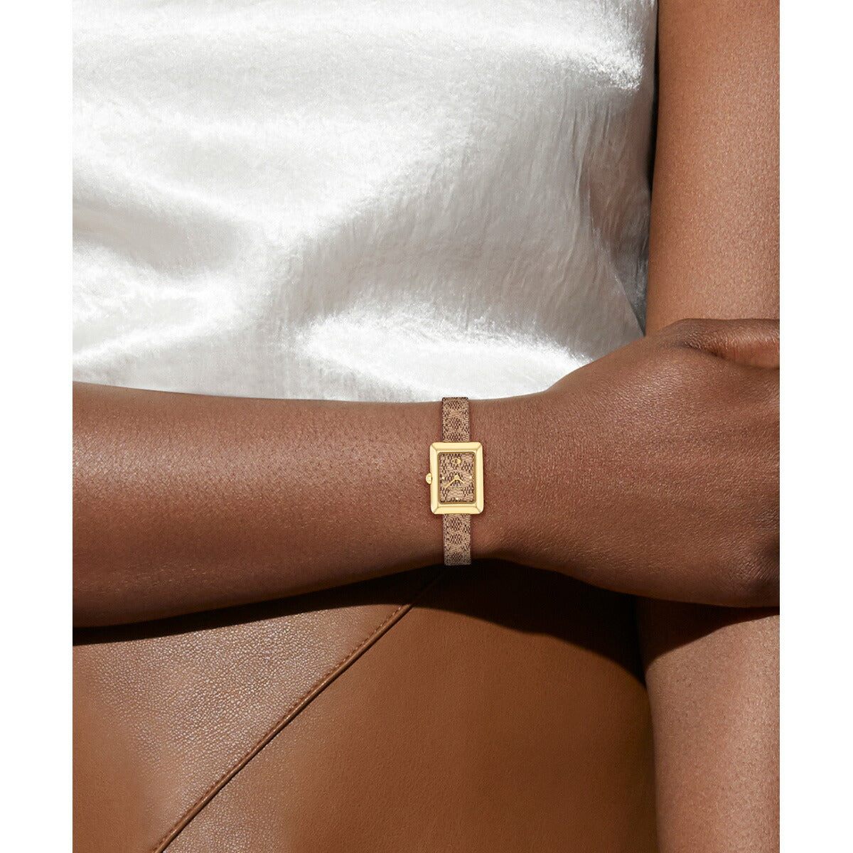 縦長のレクタングル(長方形)ケースが、クラシックでありながらモダンな印象を与えます。文字盤には、コーチのアイコニックな「C」のロゴがさりげなく配置されており、ブランドらしさを感じさせます。
