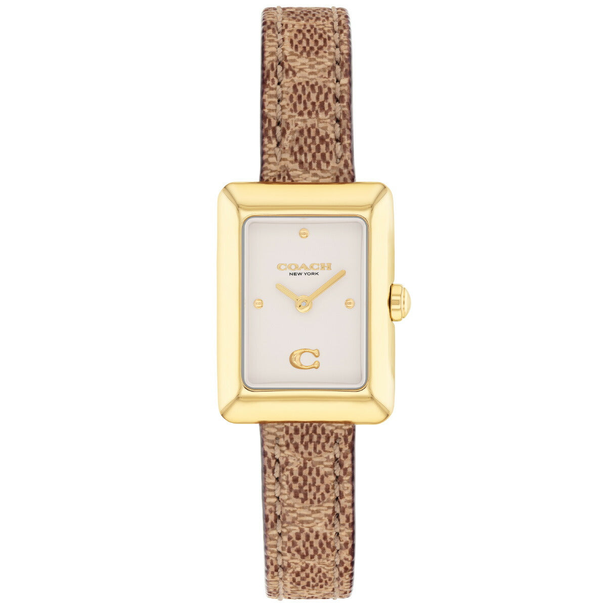 縦長のレクタングル(長方形)ケースが、クラシックでありながらモダンな印象を与えます。文字盤には、コーチのアイコニックな「C」のロゴがさりげなく配置されており、ブランドらしさを感じさせます。