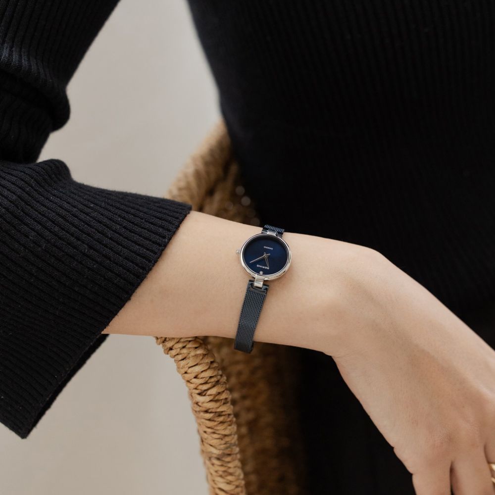 クラシックダイヤモンド(17724)は、北極の大地の永遠の美しさを一粒のダイヤモンドで表現した、時を超えて愛されるジュエリーの様なタイムピースです。BERINGならではの、控えめでありながら美しく洗練されたデザインのコレクションは、上品さと上質さを兼ね備えています。ポリッシュ仕上げのステンレススチールケースに収められた光沢感のある文字盤には、12時位置に本物のダイヤモンドが輝きます。余計な装飾を一切排したデザインの中で、この一粒のダイヤモンドが光り輝くハイライトです。表面はフラットなサファイアクリスタルガラスで守られており、傷がつきにくく、いつまでもクリアな視認性を保ちます。本質的な価値と控えめな魅力を重んじる上質のジュエリーのような時計です。