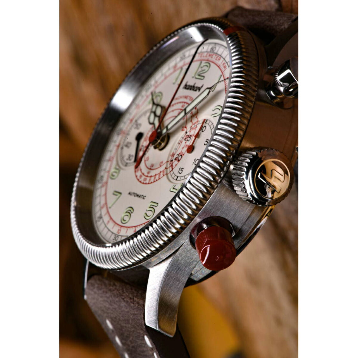 ハンハルトのタキテレコレクションは、タキメーターとテレメーター目盛がついています。タキメーターは、1km(1マイル)の距離を移動する平均速度を計測することが可能です。テレメーターは、光が見えた時点でクロノグラフ機能をスタートし、音が聞こえた時点でストップをさせることで、その場所までの距離を計測することが可能です。