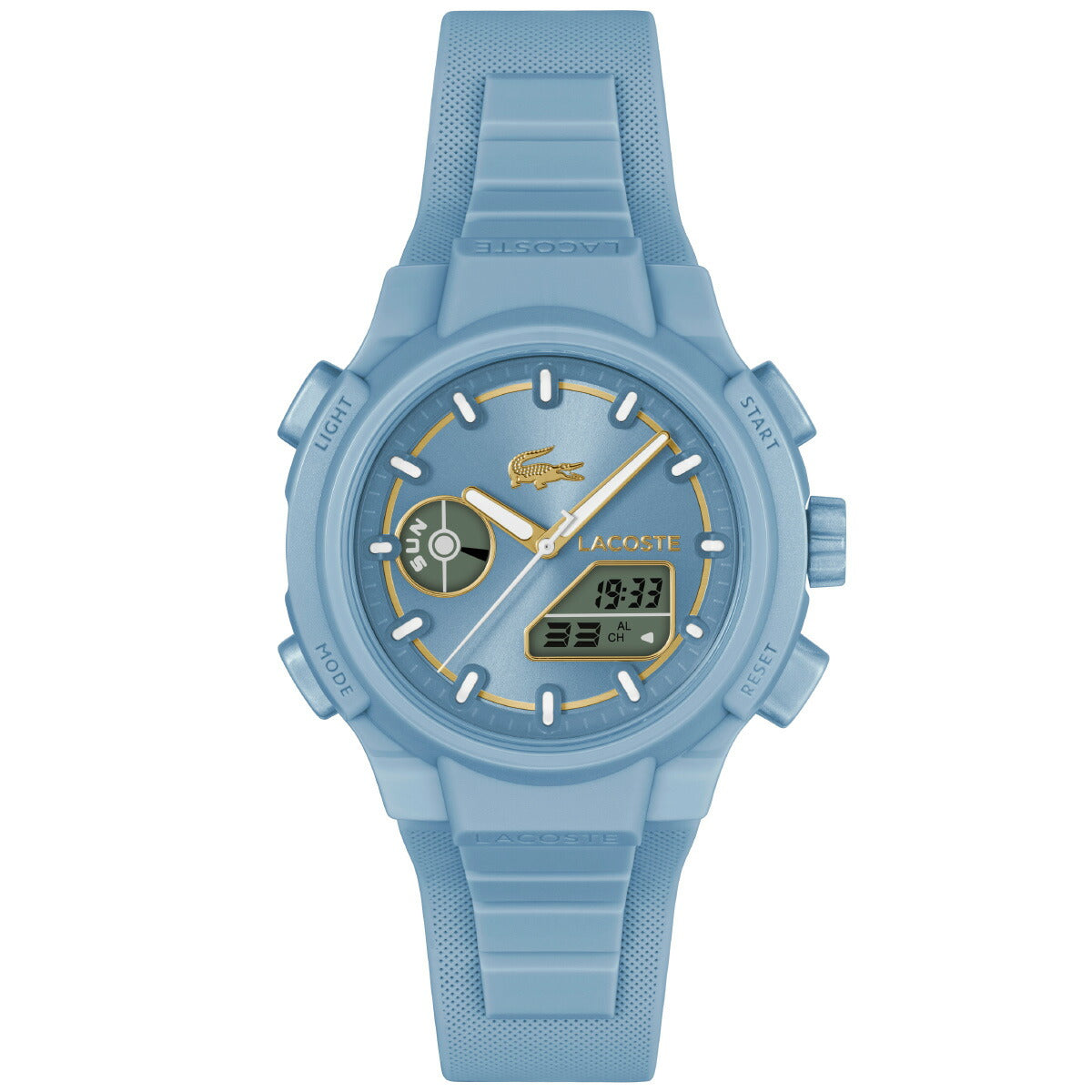 タフなルックスをペールトーンのブルーグレーでフェミニンに彩ったアナデジウォッチ。プラスチックとシリコンでステンレスケースを覆ったタフネスデザイン。アナログ針と、2つのデジタルインダイヤルを備えるアナデジ仕様。どんなコーディネイトでも目を引く40mmのビッグフェイス。フェミニンなペールトーンのカラーリング。「ラコステ」は、フランスの伝説的テニスプレイヤーであり優れた発明家でもある、ルネ・ラコステが1933年に設立したプレミアムカジュアルブランド。トレードマークであるワニは、ラコステの現役時代の粘り強いプレイスタイルから付いたニックネームが由来。ブランドのアイコンであるポロシャツをはじめ、メンズ、ウィメンズ、フットウェア、レザーグッズなどトータルシルエットを取り揃えております。