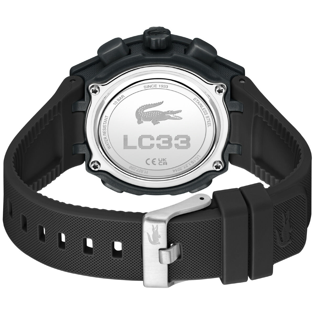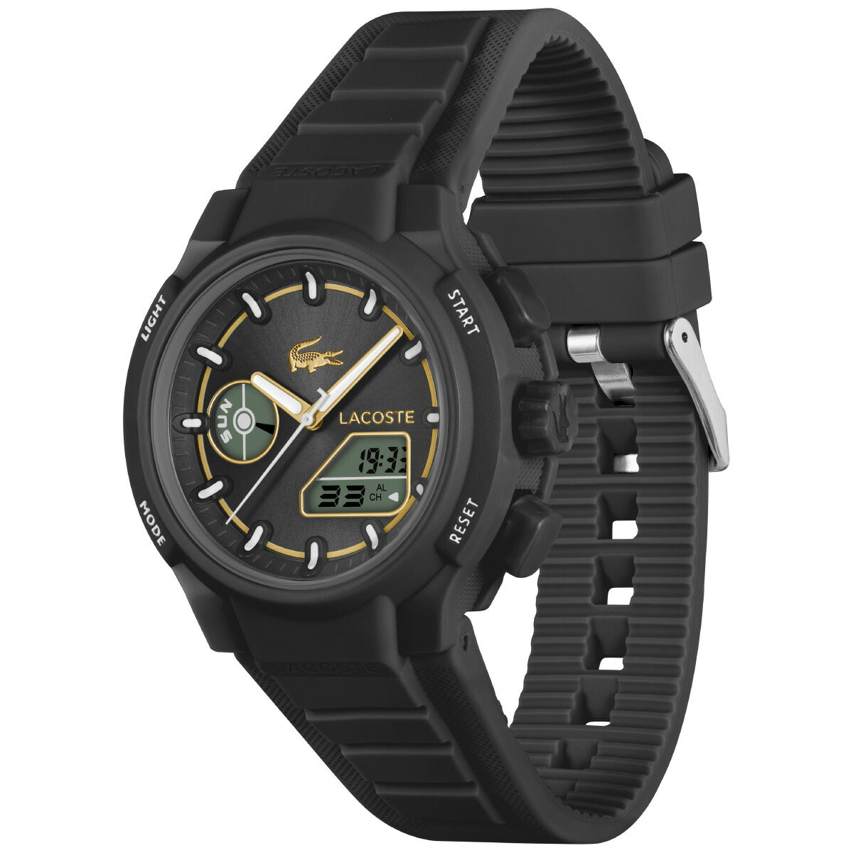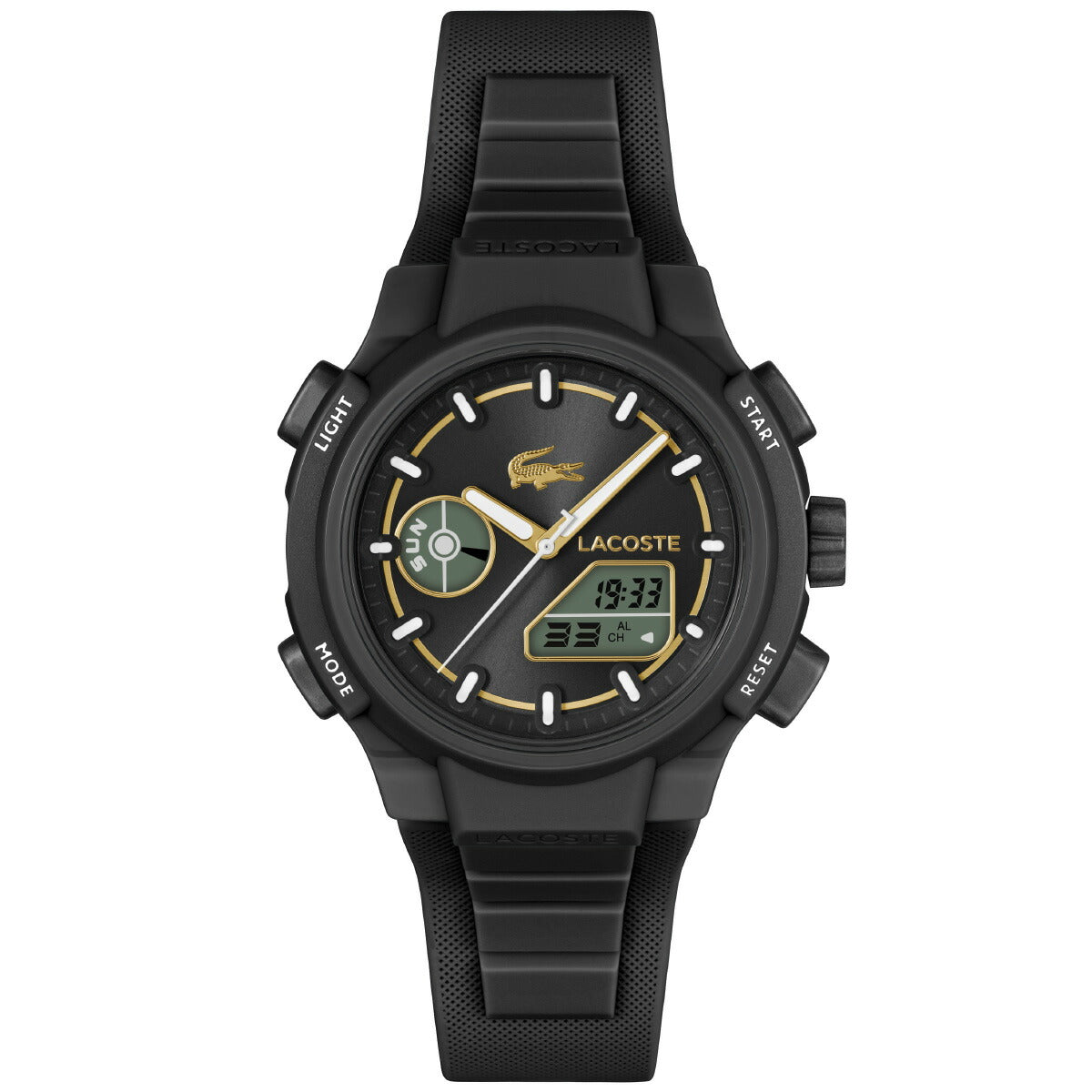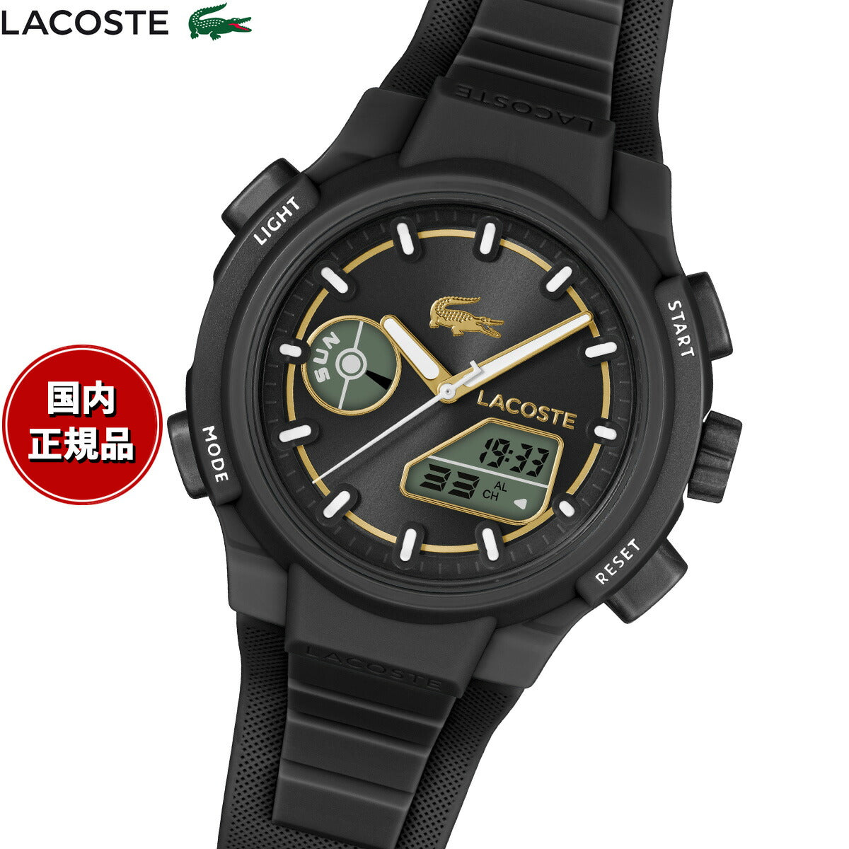 タフなルックスをシックなブラックカラーで力強く彩ったアナデジウォッチ。プラスチックとシリコンでステンレスケースを覆ったタフネスデザイン。アナログ針と、2つのデジタルインダイヤルを備えるアナデジ仕様。どんなコーディネイトでも目を引く40mmのビッグフェイス。シックなブラックカラー。「ラコステ」は、フランスの伝説的テニスプレイヤーであり優れた発明家でもある、ルネ・ラコステが1933年に設立したプレミアムカジュアルブランド。トレードマークであるワニは、ラコステの現役時代の粘り強いプレイスタイルから付いたニックネームが由来。ブランドのアイコンであるポロシャツをはじめ、メンズ、ウィメンズ、フットウェア、レザーグッズなどトータルシルエットを取り揃えております。