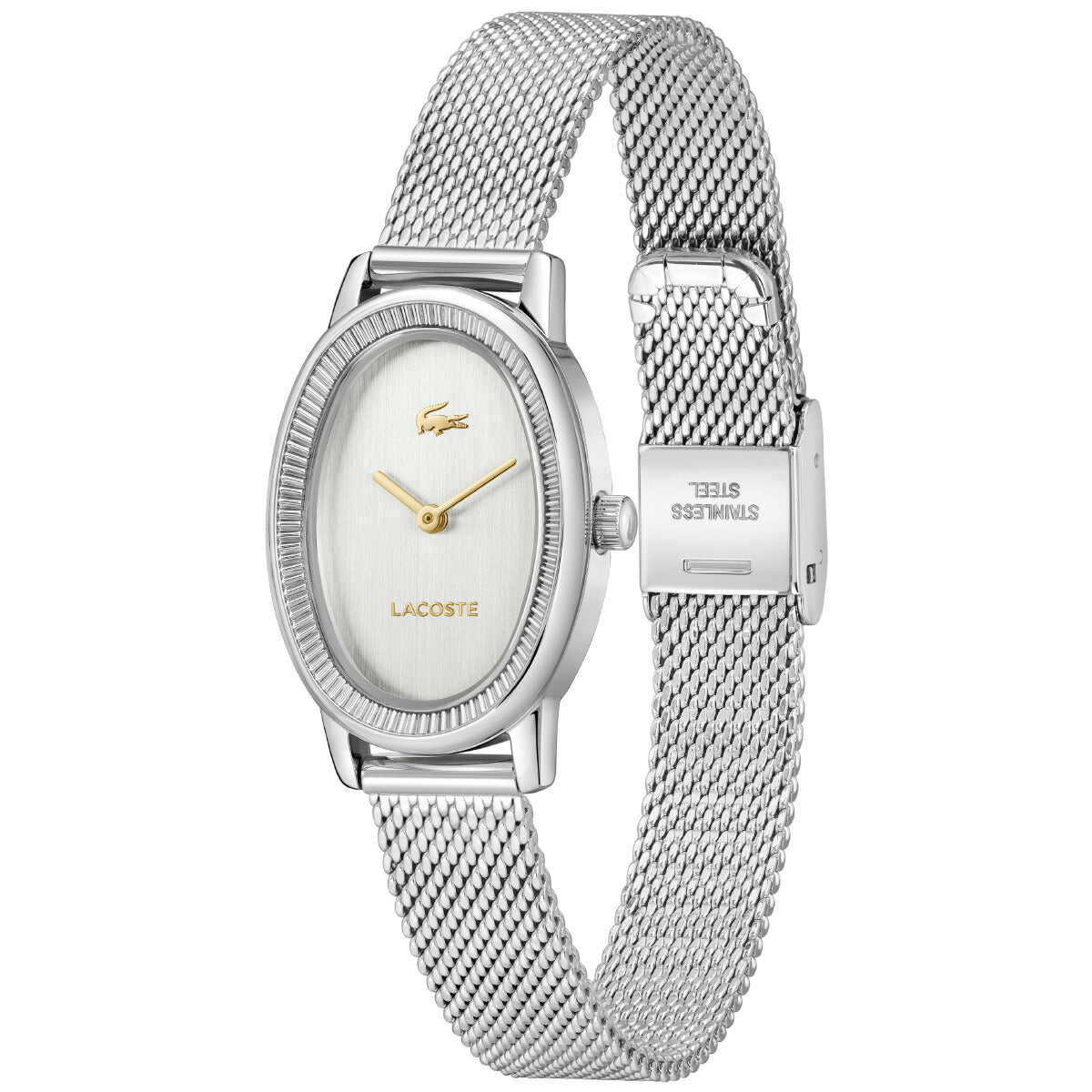 繊細な輝きを放つシルバーフェイスにゴールドの差し色を添えた、エレガントなオーバルウォッチ。テニスのDNAを受け継いだ、プリーツスカートモチーフのベゼルデザイン。上品な印象を与えるオーバルケース。軽やかで洗練された印象を引き立てるステンレスメッシュブレスレット。日常から特別なシーンまで寄り添うタイムレスなデザイン