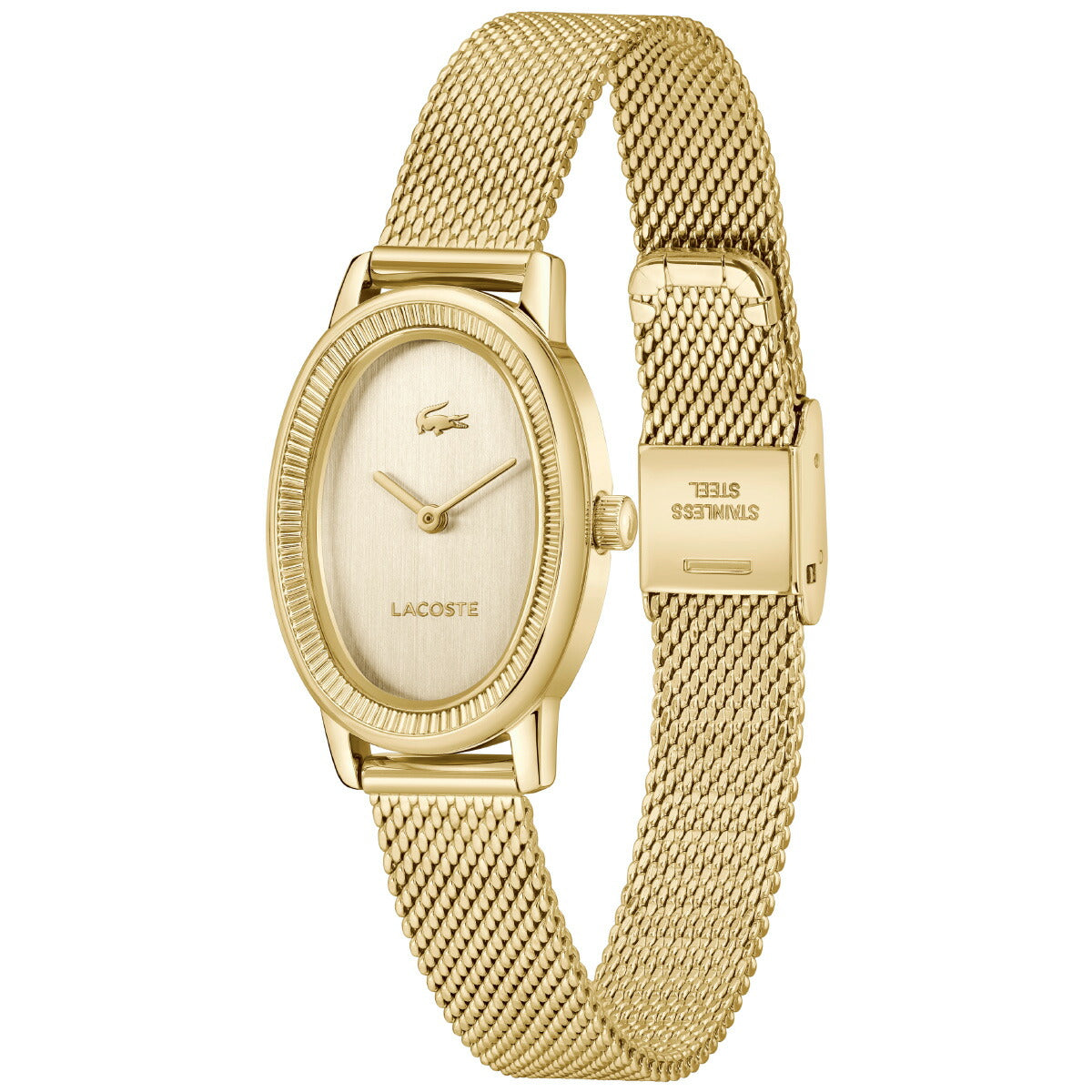 リュクスな輝きを放つゴールドトーンが華やかさを添える、エレガントなオーバルウォッチ。テニスのDNAを受け継いだ、プリーツスカートモチーフのベゼルデザイン。上品な印象を与えるオーバルケース。統一感のあるイエローゴールドのステンレスメッシュブレスレット。日常から特別なシーンまで寄り添うタイムレスなデザイン