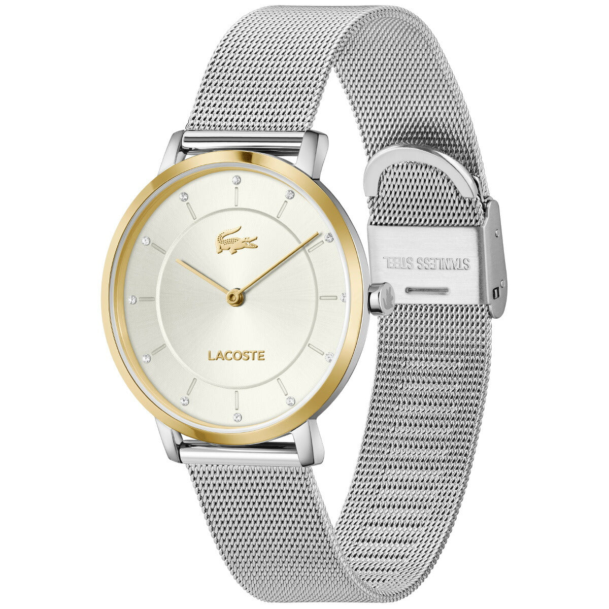 シルバーとゴールドのコントラストが上品な輝きを放つ、フレンチエレガンス香るクラシックウォッチ。繊細なメッシュブレスレットが軽やかで洗練された印象を与えるステンレス素材。ベゼルにゴールドトーンをあしらい華やかさをプラス。12個のクリスタルが煌めく文字盤が上品なアクセント。シーンを問わず手元を美しく演出するスリムな2針デザイン