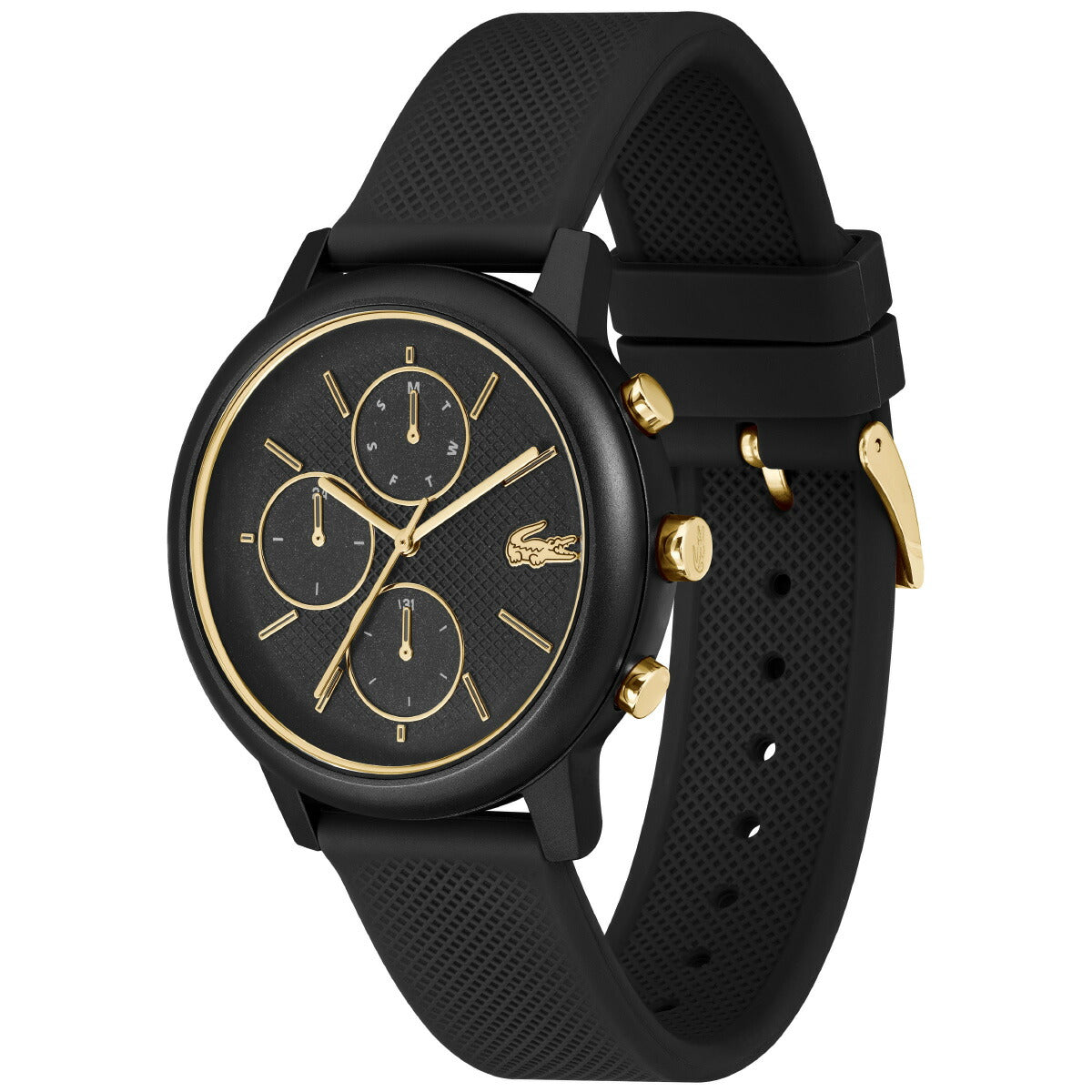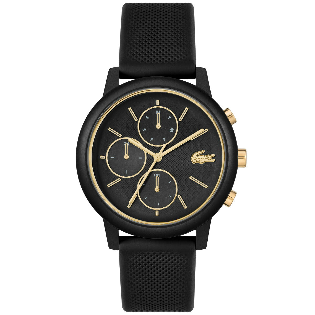 マットなブラックにゴールドの差し色が映える、リッチかつスポーティーなモダンクロノグラフ。軽量で快適な着け心地のアルミケース×シリコンストラップ。ラコステを象徴する名品ポロシャツ「L.12.12」から着想を得たデザイン。上品なゴールドトーンのメタルパーツが高級感を演出。マルチサブダイヤルを備えたクロノグラフ構成。シンプルで都会的なモノクロームデザインにワニロゴをアクセント配置