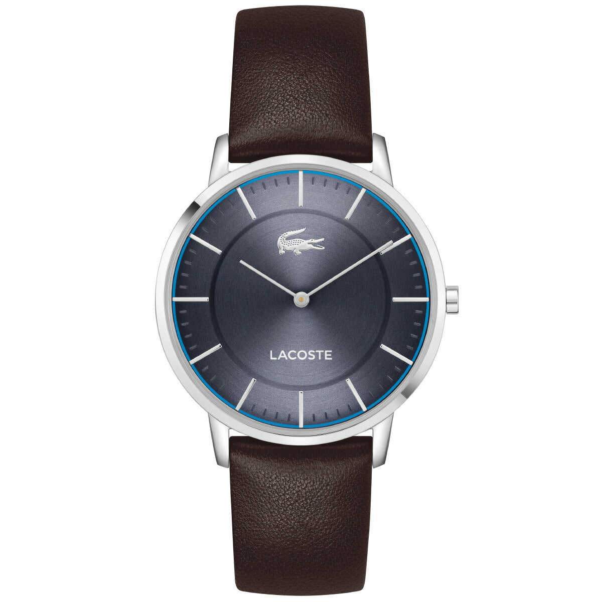 ネイビーフェイスにブルーラインが映える、フレンチエレガンス香るクラシックウォッチ。ポリッシュ仕上げのステンレスケース×カーフレザーストラップ。洗練された印象を演出する2針構成のスリムフェイス。さりげないミニットトラックとワニロゴがアクセント。カジュアルからフォーマルまで対応するユニバーサルデザイン