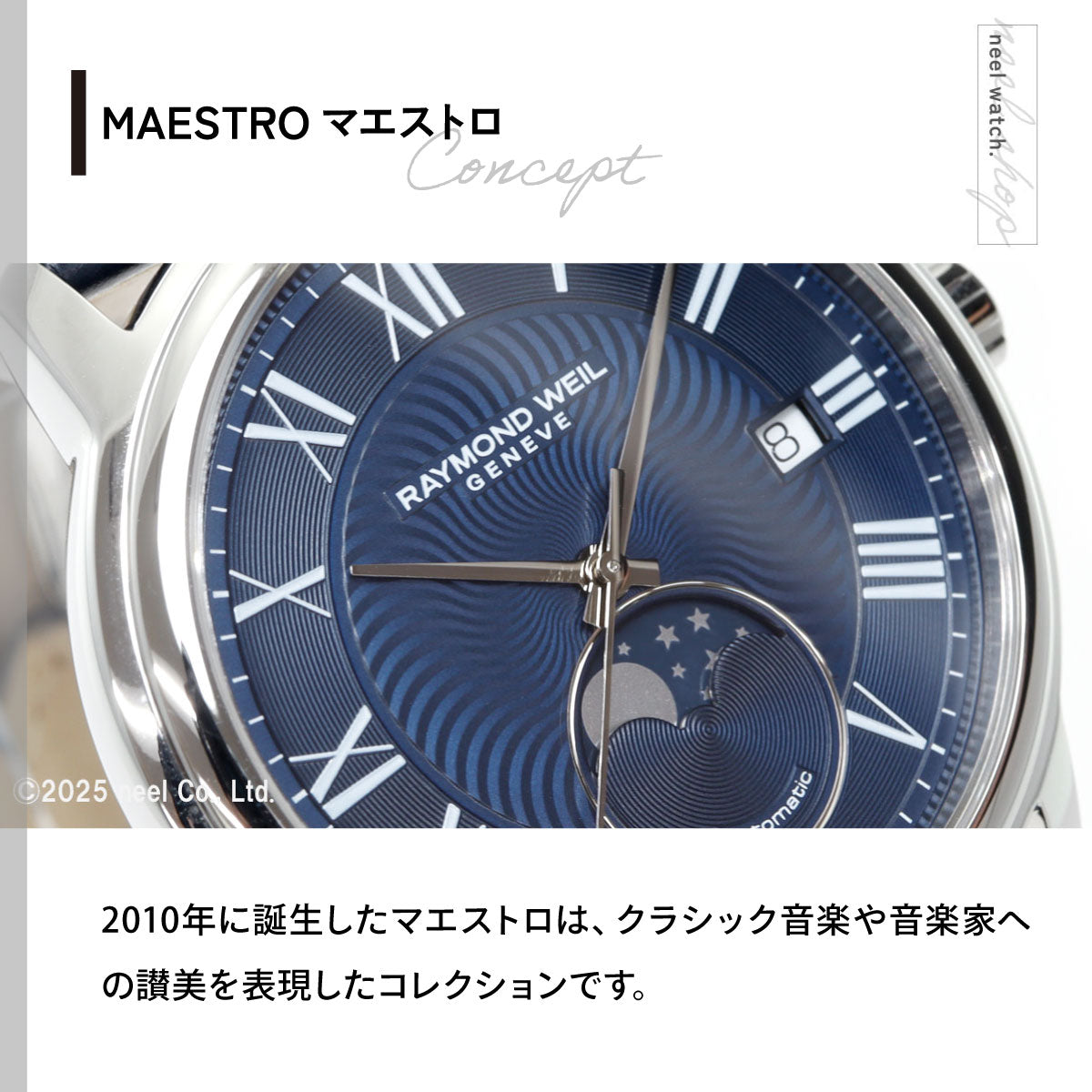 ムーンフェイズ機能を持つマエストロは、時間の流れに月の満ち欠けをシンクロさせた、優雅かつ精巧なタイムピースです。自動巻きキャリバー・RW4280、ローマ数字インデックス・中央の波型模様・ムーンフェイズ機能を備えたダイアルが特徴です。2010年に誕生したマエストロは、クラシック音楽や音楽家への讃美を表現したコレクションです。スイス時計の伝統的な製造技術を受け継ぎながら、上品さと洗練されたイノベーションを融合しています。