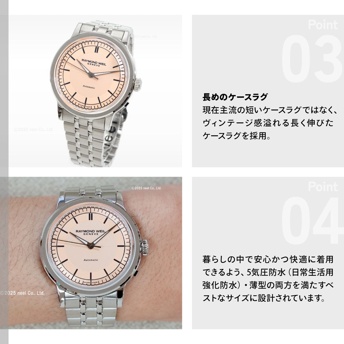 「ミレジム(millesime)」は、フランス語でヴィンテージを意味します。1930年代に流行したセクターダイアルや主にプラスチック製風防に見られたボックス型などの古典的なディティールに、現代の技術・素材・トレンドを交えるレイモンド・ウェイル独自の解釈を加えた、「ネオ・ヴィンテージウォッチ」です。
