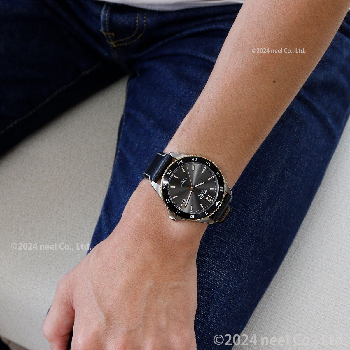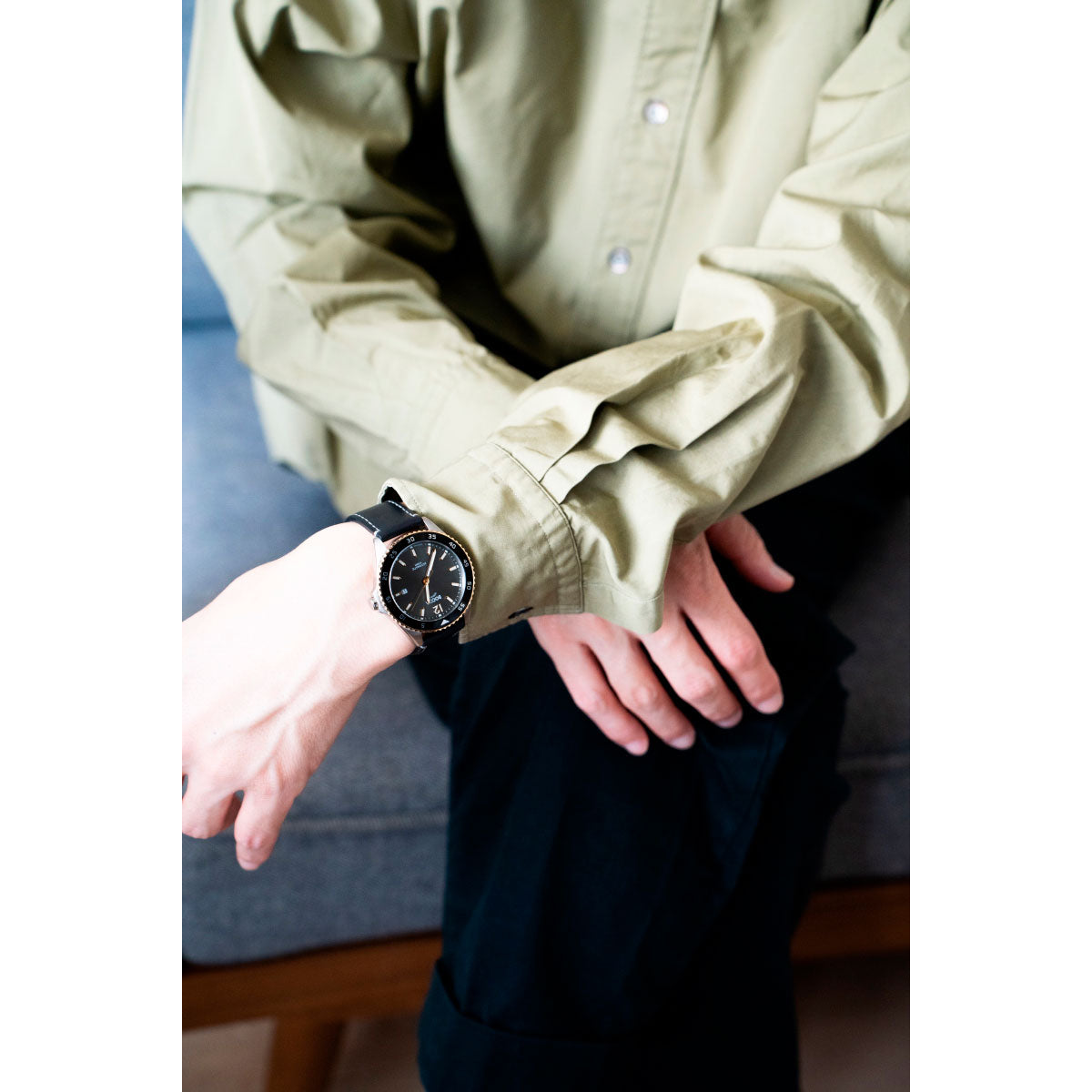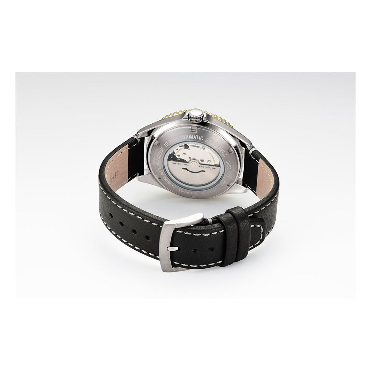 ピュアチタニウムで軽量さを実現したオートマチックモデル。ゴールドをアクセントに取り入れたモデルは、サンレイ文字盤とバーインデックスでシャープで存在感のある仕上がりになっています。