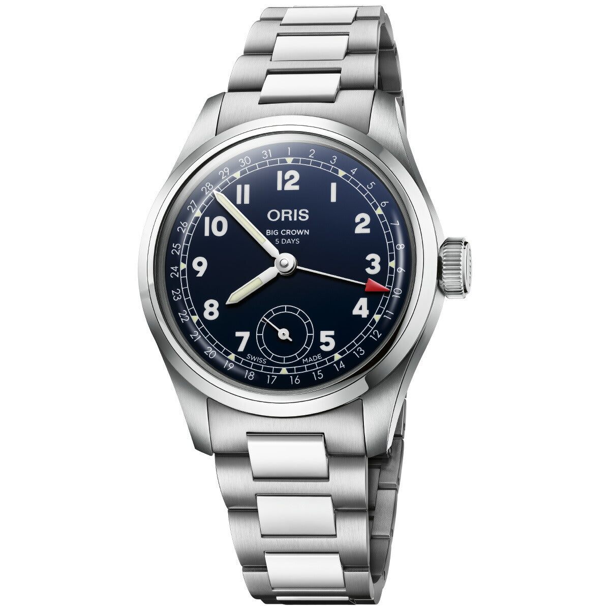 オリスの代名詞ともいえるコレクション、「ビッグクラウンポインターデイト」に高機能を実現した自社開発キャリバー403を搭載。5日間パワーリザーブ、高耐磁性、10年保証という高機能を持ちながら、38mm径のクラシカルなケースにブランド伝統のポインターデイトと6時位置のスモールセコンドを配したシグネチャーモデルです。深いネイビーの文字盤にポリッシュ仕上げとサテン仕上げのH型リンクを組み合わせたブレスレットの仕様で、どんなシーンでも使いやすいデザインです。ブレスレットと一体型のクラスプはオリス独自開発で軽やかでありつつ高級感の感じられる着け心地です。
