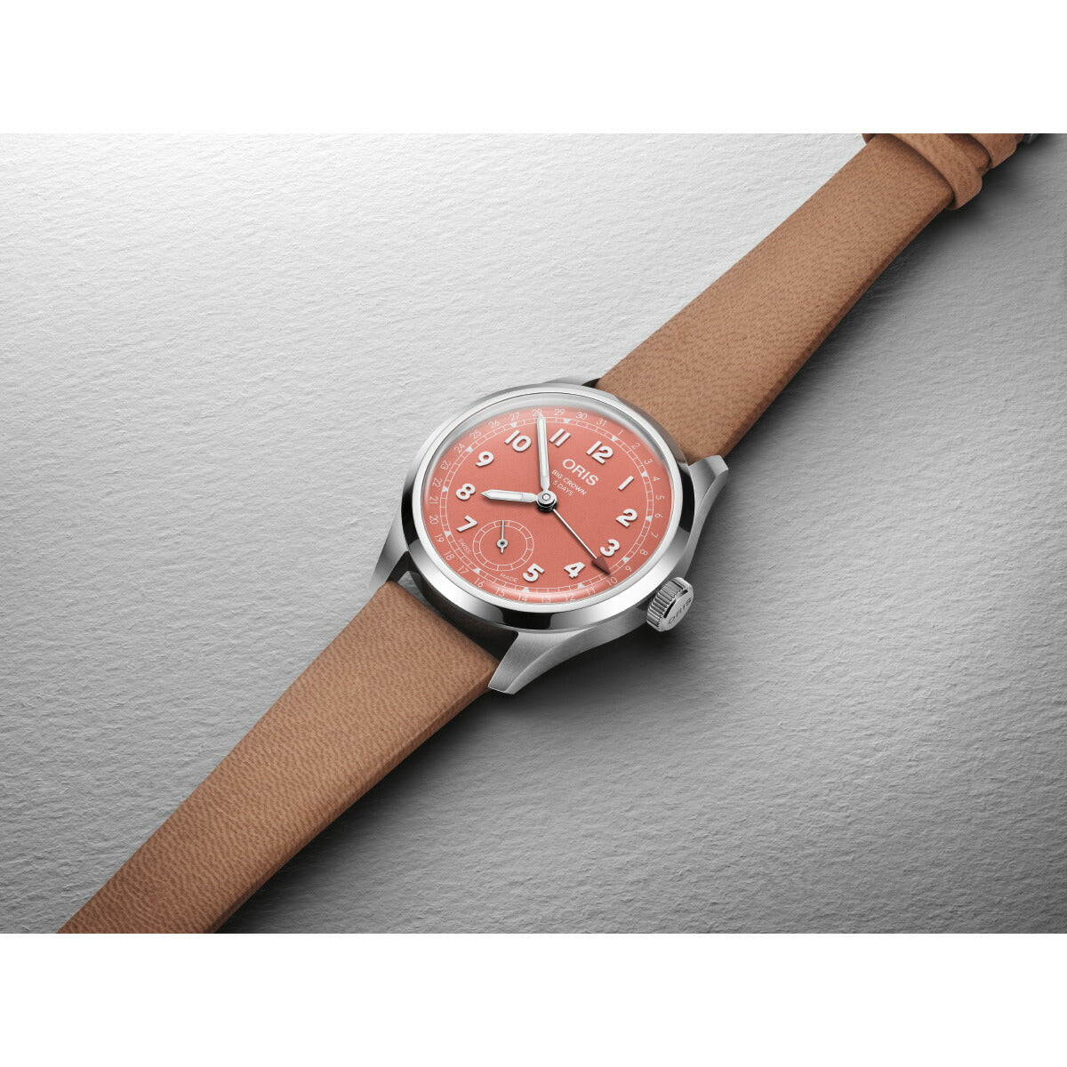 オリス伝統のビッグクラウンポインターデイト。2025年の最新作はフレッシュな見た目と気分が上がるカラーが特徴のスイス製機械式時計です。搭載する自社開発キャリバー403は120時間(5日間)パワーリザーブ、高耐磁性、10年保証という高機能で長く安心して使いやすい自動巻きムーブメント。40mm径のクラシカルなケースにオリスを象徴するポインターデイトと6時位置のスモールセコンドを配したシグネチャーモデルです。オレンジとブラウンを混ぜたようなテラコッタダイアルは肌馴染みの良い色で、様々なファッションスタイルに合わせる差し色としてお勧めです。ストラップは100%植物タンニンで鞣したサステナブルレザーのみを使うチェルボボランテのブラウンの鹿革ストラップを組み合わせています。オリスが開発したフォールディングバックルには、長さを微調整できる便利なアジャストメントシステムが付いており環境によって手首のサイズが変わっても、微細に調整することが可能です。