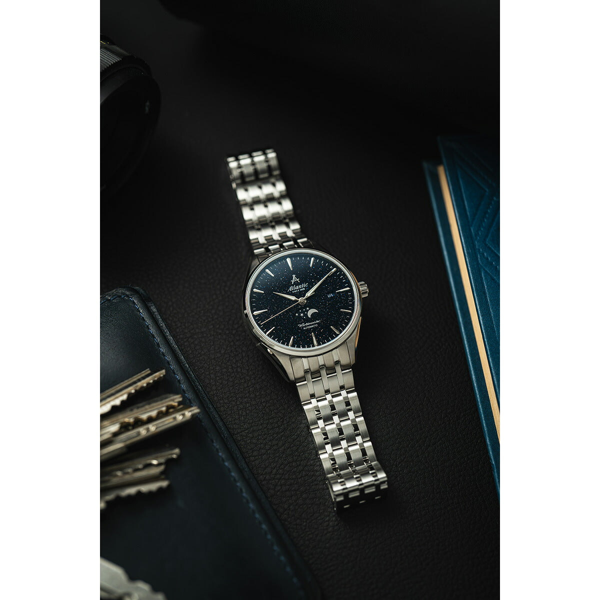 アトランティック ワールドマスター ナイトスカイ ムーンフェイズは、魅惑的なブルーの文字盤に天空の旅を表現しています。アベンチュリンは地球の奥深くで生まれた石英鉱物で、その無数の内包物に反射する光によって生命を吹き込まれます。その光輝く様子が複雑なムーンフェイズ表示と相まって、まるで広大な星空を見つめているかのような感覚をもたらします。エレガントにデザインされたステンレススチール製ケースに収められたこの時計は、両面無反射処理を施した傷のつきにくいサファイアクリスタルを誇り、どの角度から見ても鮮明です。シースルーのケースバックを覗けば、SW 280.1 オートマティック・ムーンフェイズ・ムーブメントの魔法を目の当たりにすることでしょう。26個のルビー、毎時28800振動、38時間のパワーリザーブを誇るこのムーブメントは、時計製造の精度と革新性を証明しています。ブラックタイのイベントに出席するときでも、内輪の夜を楽しむときでも、アトランティック ワールドマスター ナイトスカイはあらゆる装いをシームレスに引き立てます。バタフライバックル付きの頑丈なステンレススチール製ブレスレット、または贅沢なネイビーのレザーストラップの2モデルをラインナップ。どちらがお好みでも、ワールドマスターは快適さとスタイルの両方をお約束します。アトランティック ワールドマスター ナイトスカイ ムーンフェイズで、夜空の美しさを毎日お楽しみください。星空の旅が待っています。