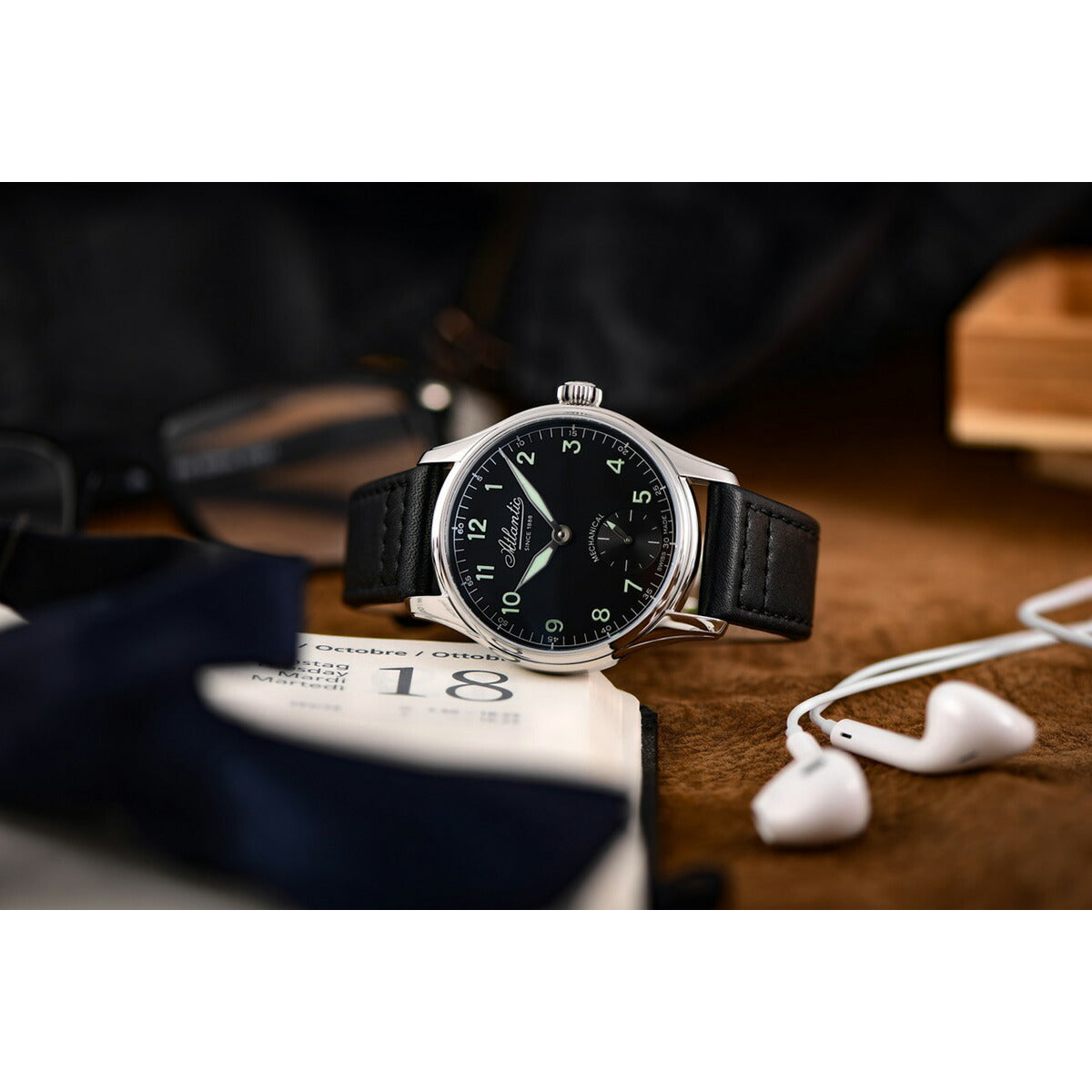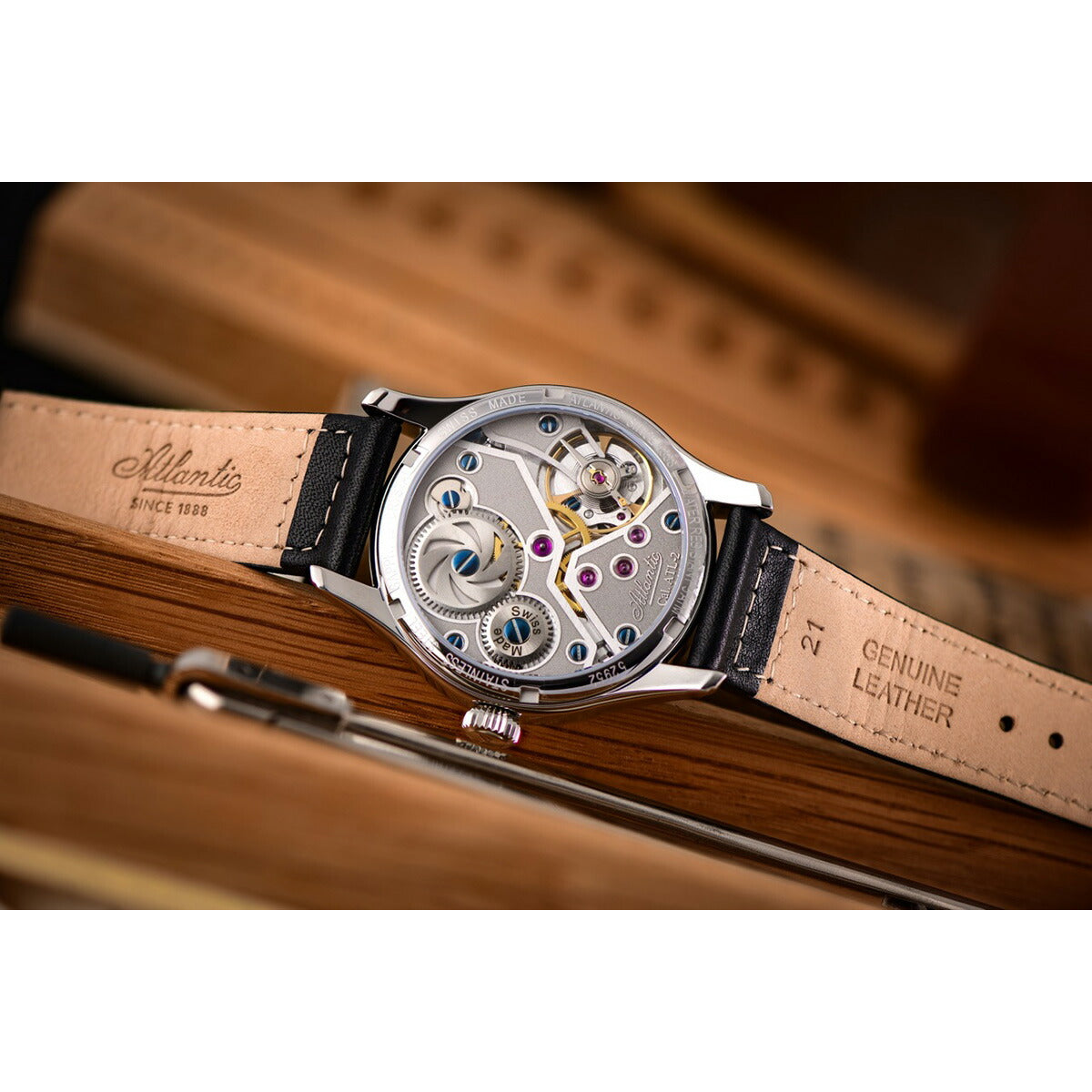 マニュファクチュールキャリバー搭載のヴィンテージモデル。このニューモデルは、時計製造の伝統の中で最も高い基準に基づいて開発された新しいアトランティック自社製ムーブメントを搭載しています。この機械式マニュファクチュールキャリバーATL-2は、細部に至るまでこだわり抜いて製作され、フルサイズのシースルーケースバックから眺めることができます。ケースは高品質のステンレススチール製で、50m防水です。ヴィンテージ感のある現代的なデザインは、スモールセコンド表示の美しい文字盤とダブルドーム型サファイアクリスタルによって強調されています。