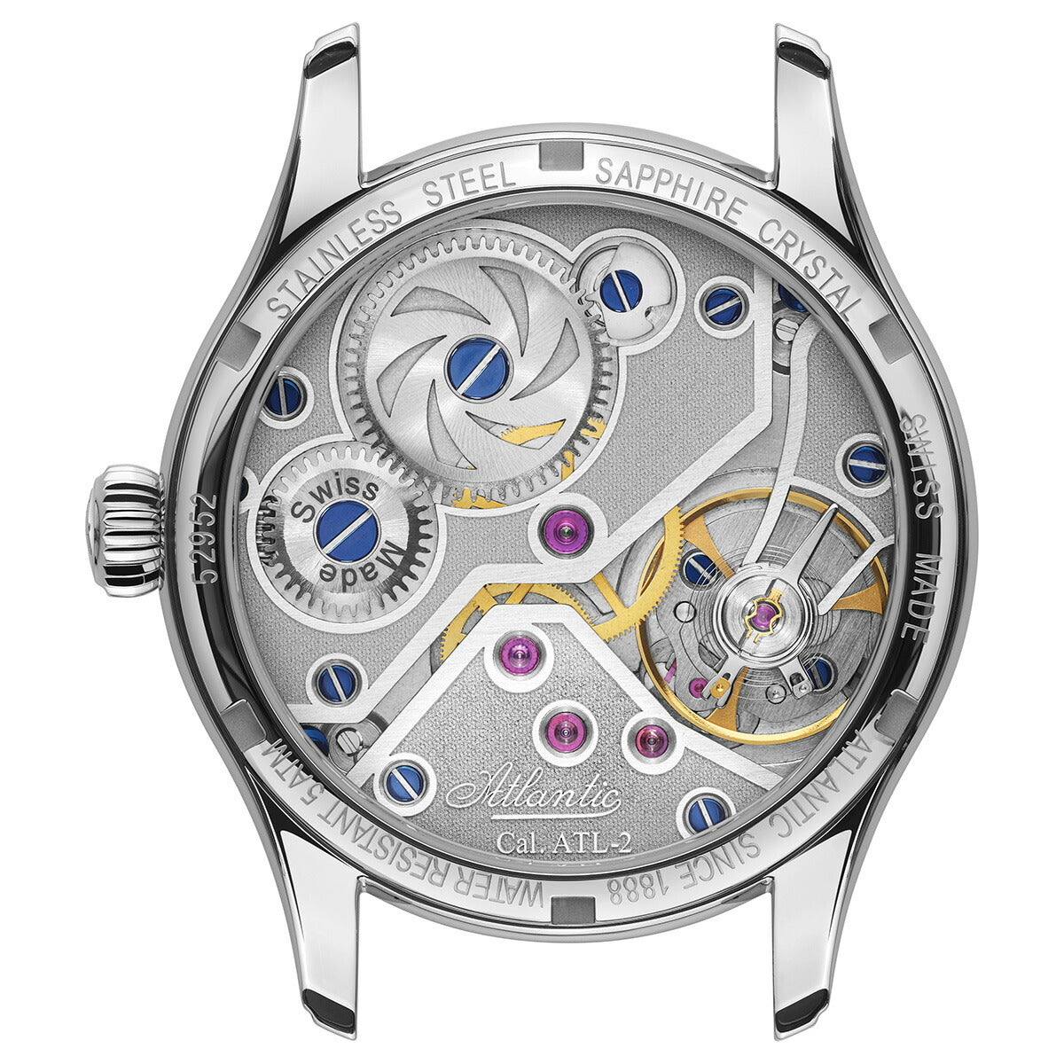 マニュファクチュールキャリバー搭載のヴィンテージモデル。このニューモデルは、時計製造の伝統の中で最も高い基準に基づいて開発された新しいアトランティック自社製ムーブメントを搭載しています。この機械式マニュファクチュールキャリバーATL-2は、細部に至るまでこだわり抜いて製作され、フルサイズのシースルーケースバックから眺めることができます。ケースは高品質のステンレススチール製で、50m防水です。ヴィンテージ感のある現代的なデザインは、スモールセコンド表示の美しい文字盤とダブルドーム型サファイアクリスタルによって強調されています。