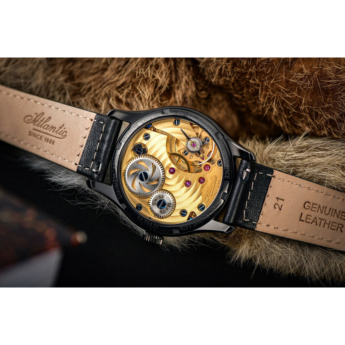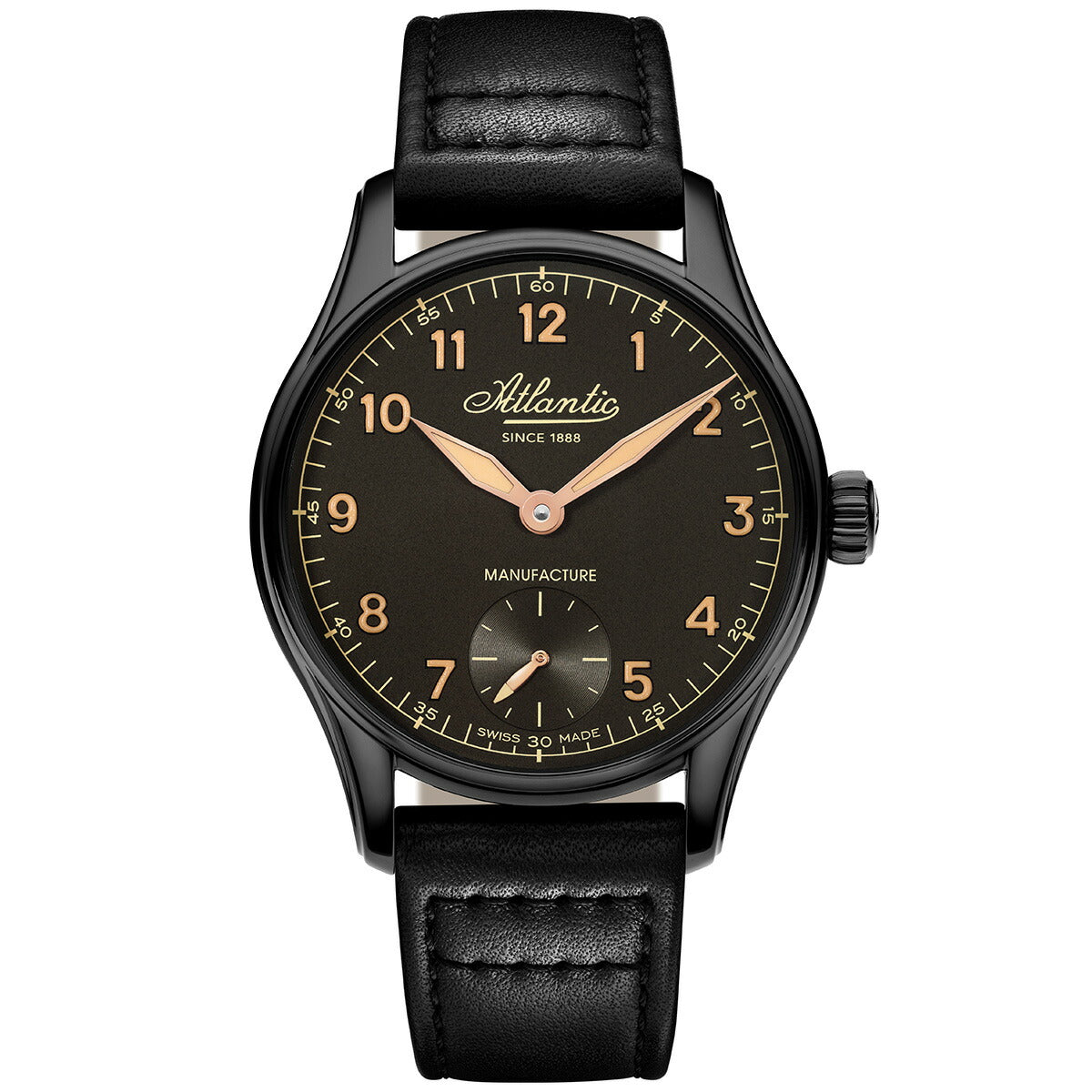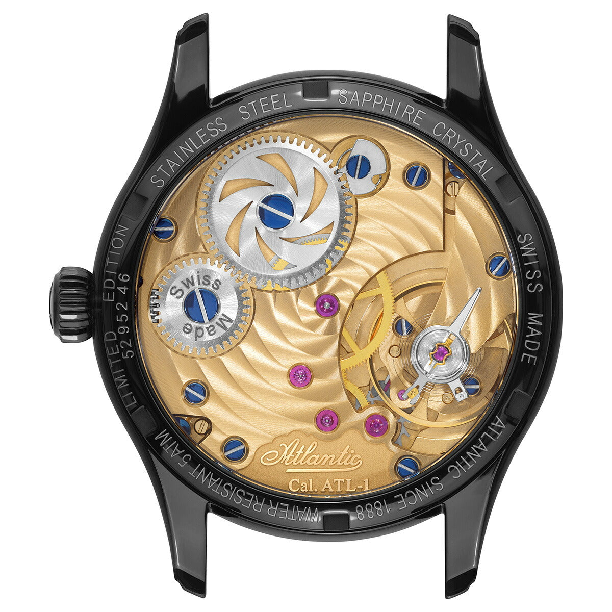 新しいマニュファクチュールキャリバー搭載の限定モデル。このモデルは、時計製造の伝統の中で最も高い基準に基づいて開発された新しいアトランティック自社製ムーブメントを搭載しています。この機械式マニュファクチュールキャリバーATL-1は、細部に至るまでこだわり抜いて製作され、フルサイズのシースルーケースバックから眺めることができます。ケースは高品質のステンレススチール製で、耐傷性と高い輝きを実現するためにPVDコーティングが施されています。ヴィンテージ感のあるコンテンポラリーなデザインは、2種類の本革ストラップによって強調されています。