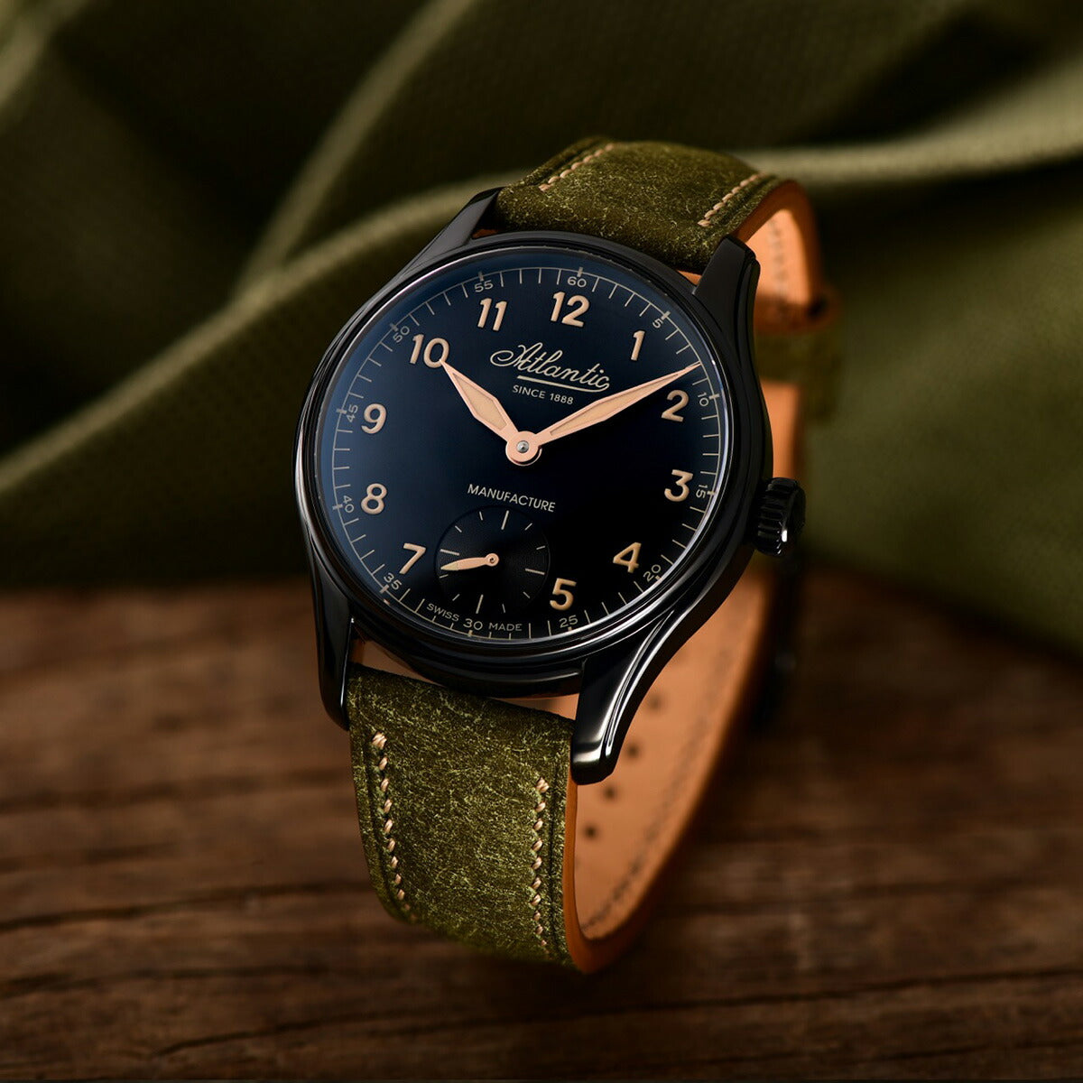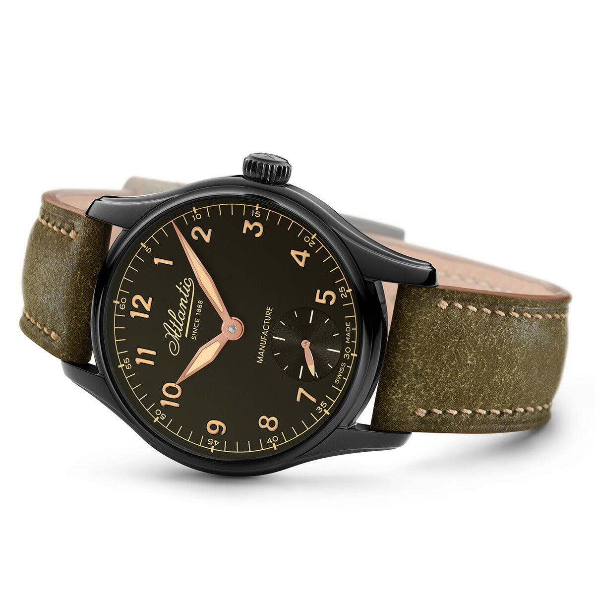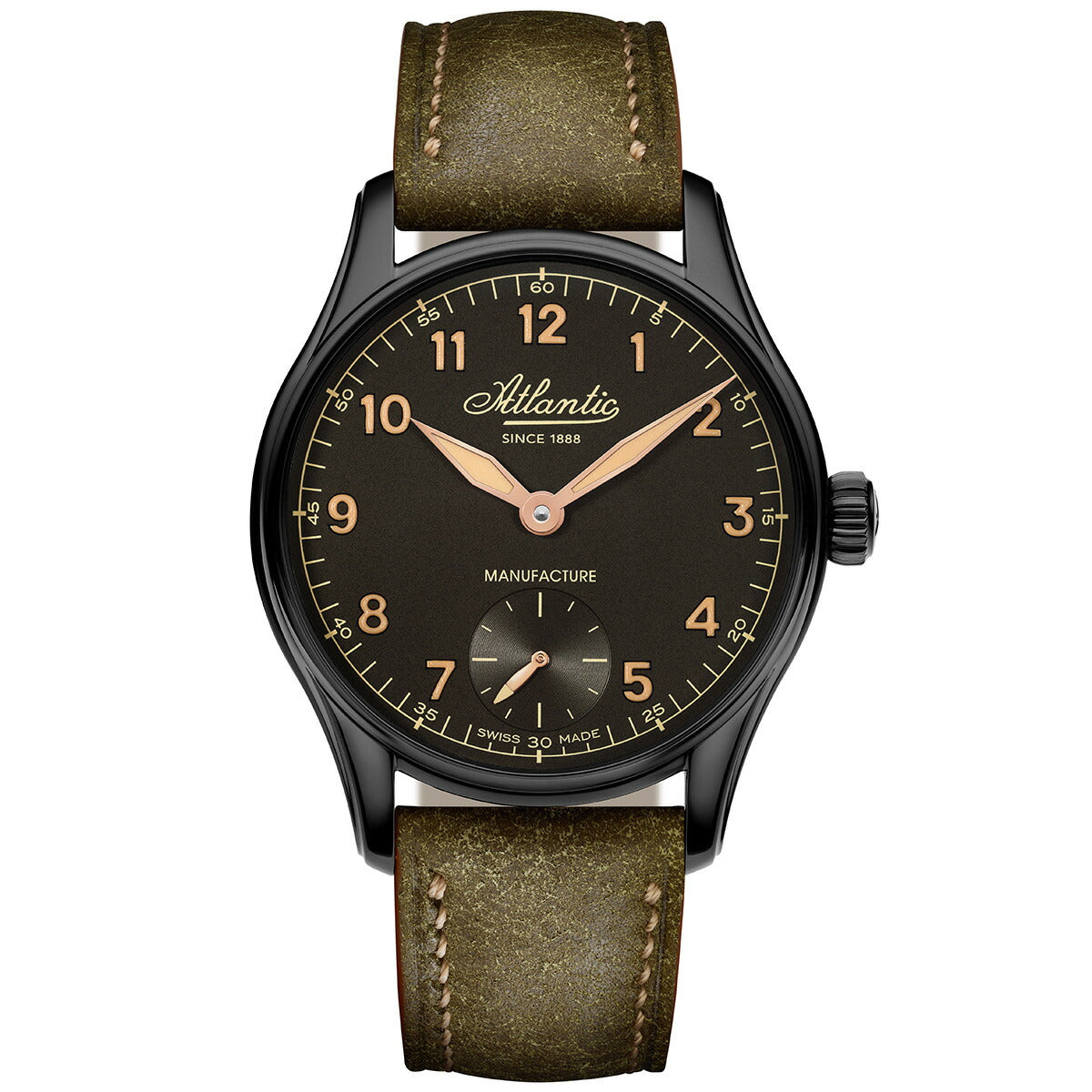 新しいマニュファクチュールキャリバー搭載の限定モデル。このモデルは、時計製造の伝統の中で最も高い基準に基づいて開発された新しいアトランティック自社製ムーブメントを搭載しています。この機械式マニュファクチュールキャリバーATL-1は、細部に至るまでこだわり抜いて製作され、フルサイズのシースルーケースバックから眺めることができます。ケースは高品質のステンレススチール製で、耐傷性と高い輝きを実現するためにPVDコーティングが施されています。ヴィンテージ感のあるコンテンポラリーなデザインは、2種類の本革ストラップによって強調されています。
