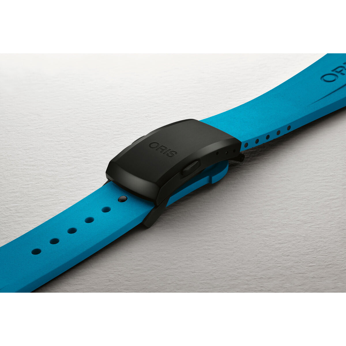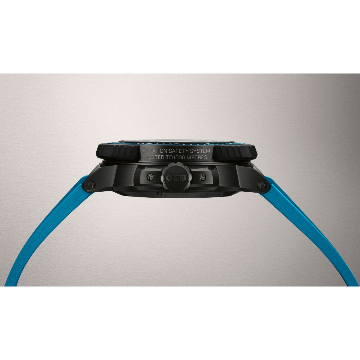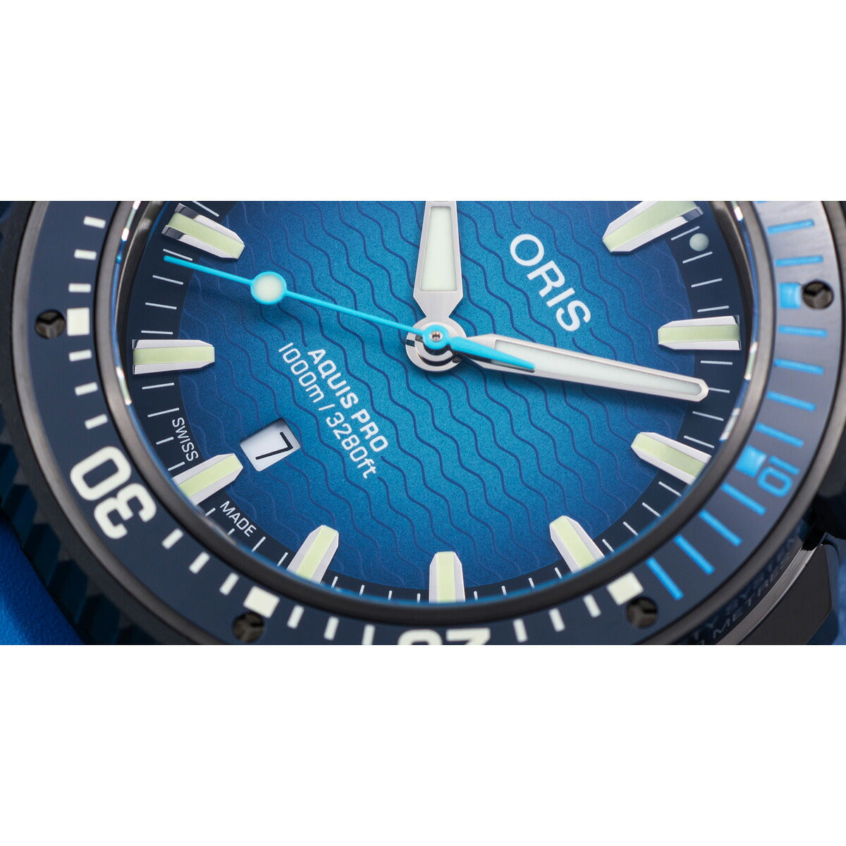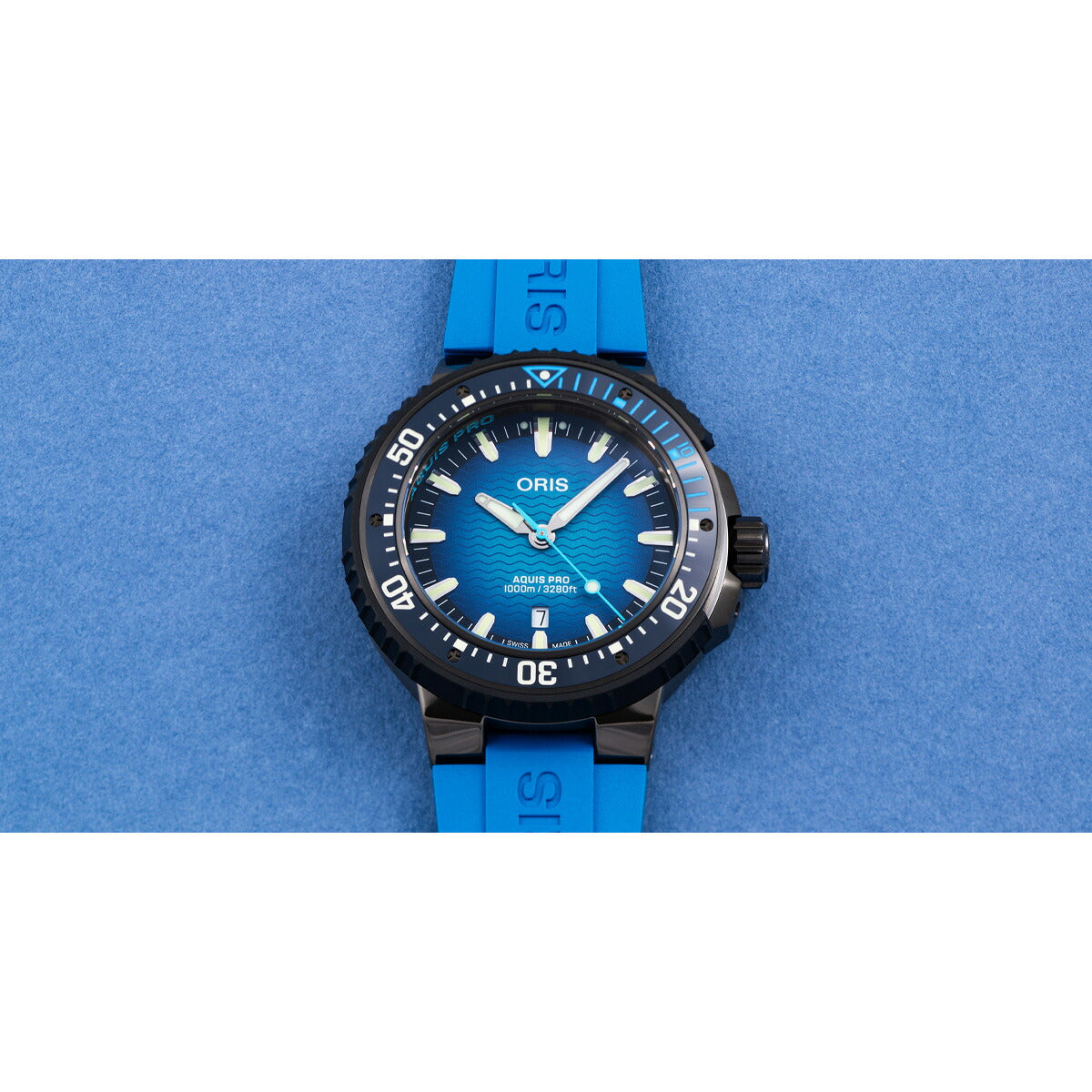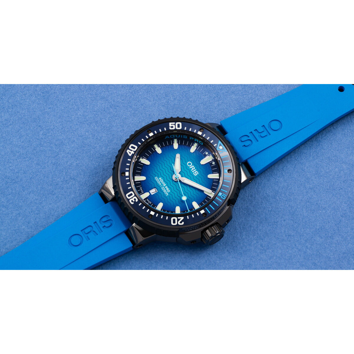 アクイスプロ1000mは世界のダイビングのプロフェッショナルとの共同開発で誕生し、その卓越した性能と信頼性でプロフェッショナルの要求を満たす唯一無二の存在です。49.5mm径のグレーPVD加工チタンケースは圧倒的な防水性能のみならず、水中で誤操作の心配なくダイビングベゼルを使用できるよう設計されたローテーションセーフティベゼルを搭載。付属の工具でブラックとブルーのラバーストラップを自在に付け替えられる使用です。波模様のブルーグラデーションダイアルが極限の環境下でも揺るがないオリスの精緻な時計作りを体現します。