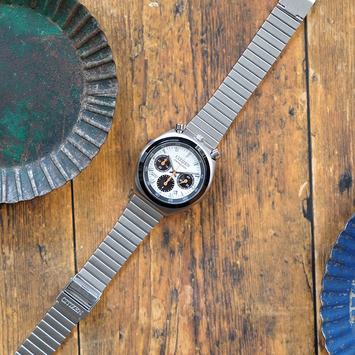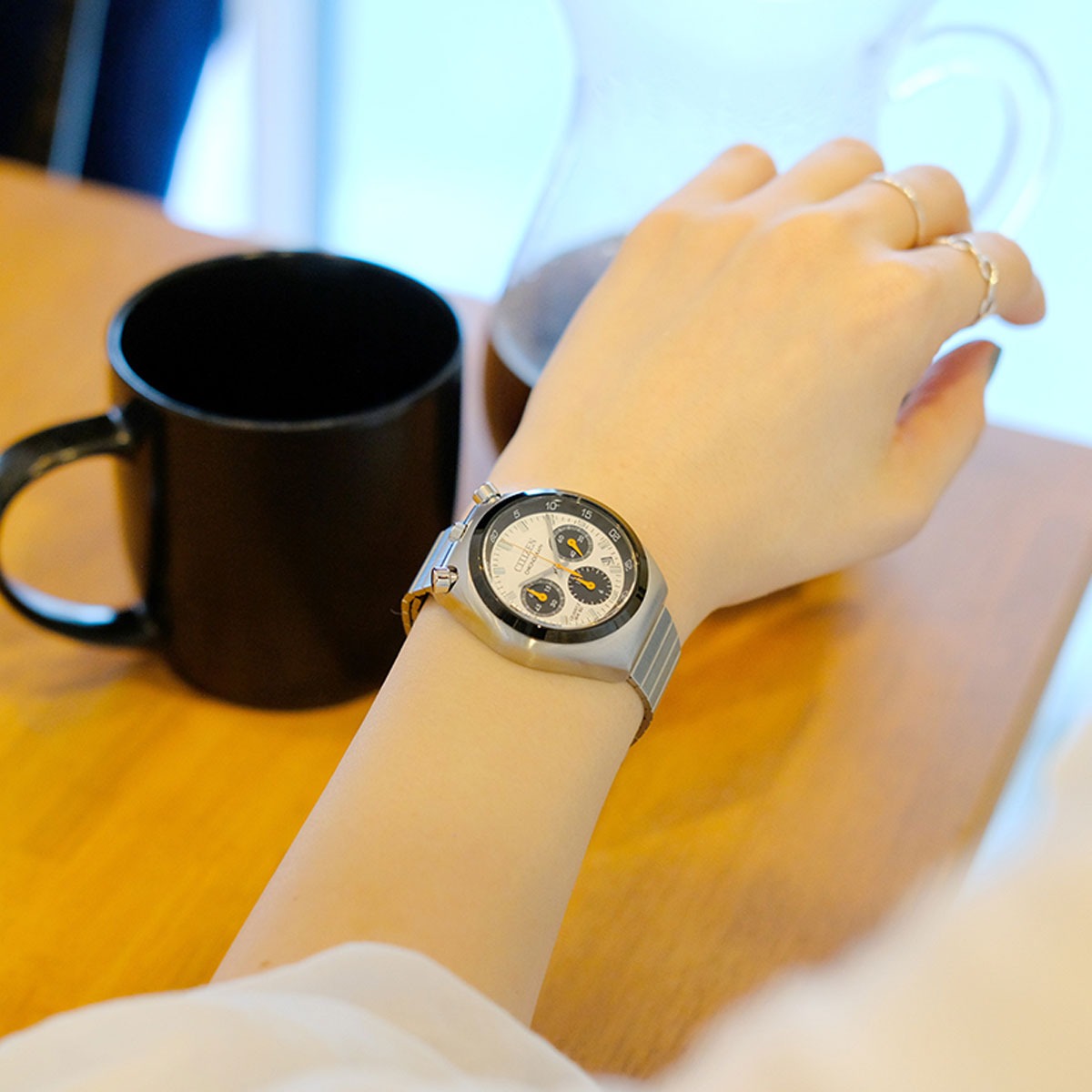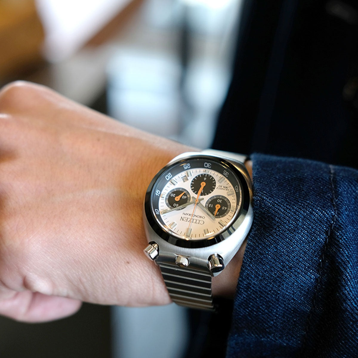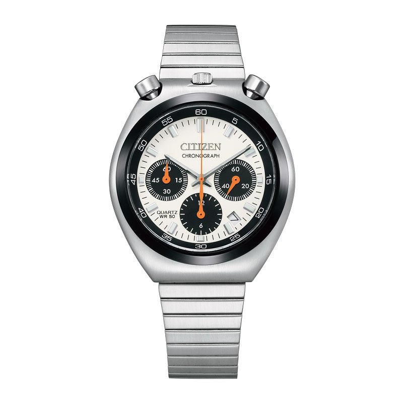 1970年代に、「ツノクロノ」の愛称で親しまれたシチズン初の本格クロノグラフ機能付き時計をルーツとしたモデル。ケースの12時側に配置されたプッシュボタンがツノのように見えることで、「ツノクロノ」の愛称で呼ばれてきたアイコンモデル。シルバーの文字板にオレンジの差し色を入れ、当時のデザインを復刻しました。※裏ぶたの生産国に関する刻印は実際の商品と異なる場合があります。