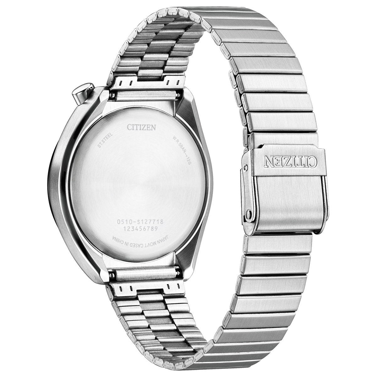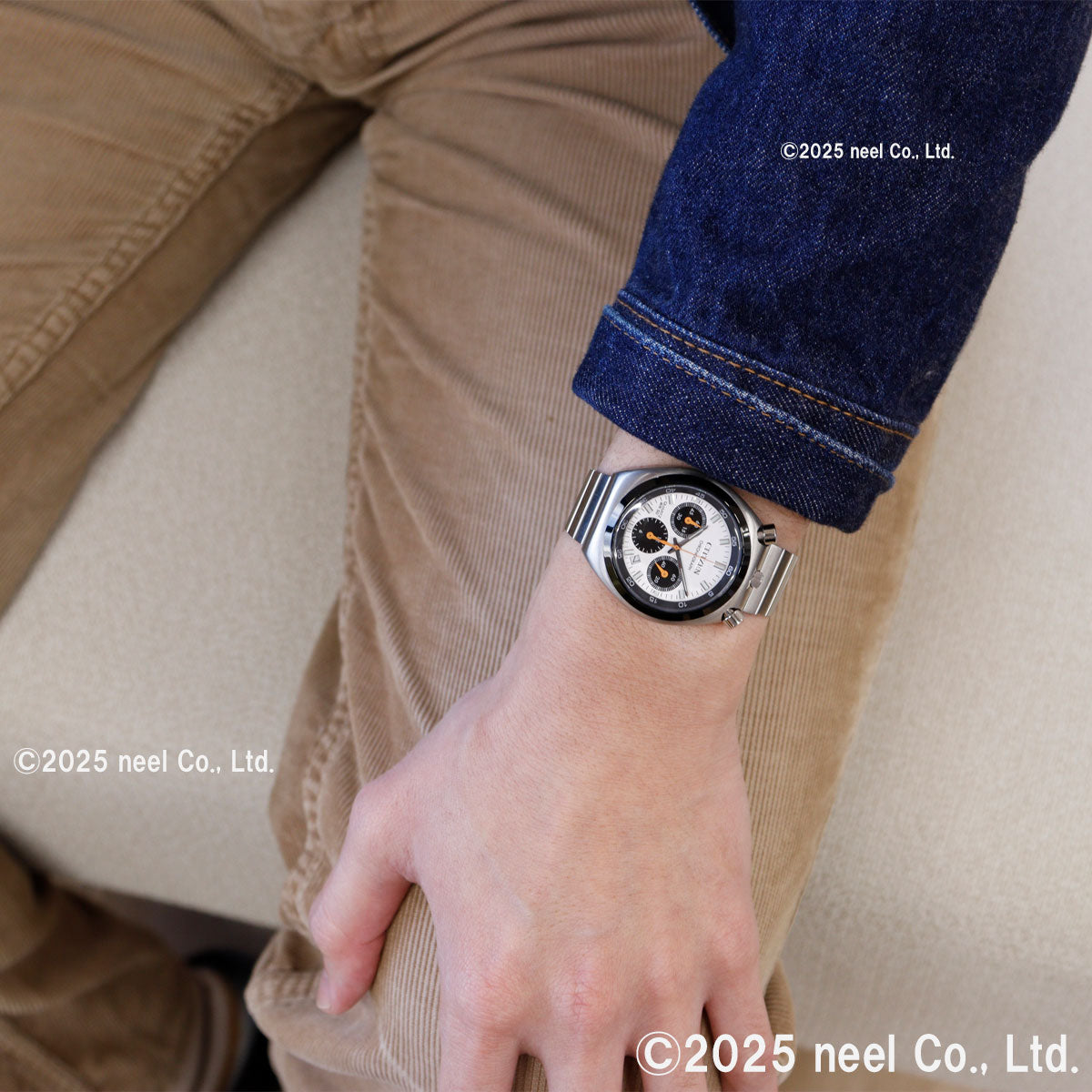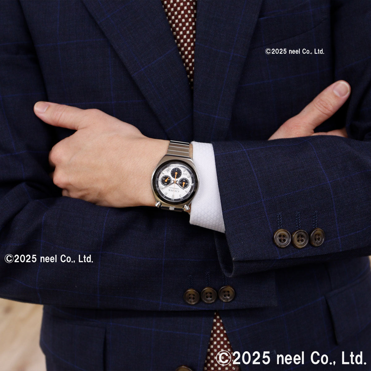 1970年代に、「ツノクロノ」の愛称で親しまれたシチズン初の本格クロノグラフ機能付き時計をルーツとしたモデル。ケースの12時側に配置されたプッシュボタンがツノのように見えることで、「ツノクロノ」の愛称で呼ばれてきたアイコンモデル。シルバーの文字板にオレンジの差し色を入れ、当時のデザインを復刻しました。※裏ぶたの生産国に関する刻印は実際の商品と異なる場合があります。