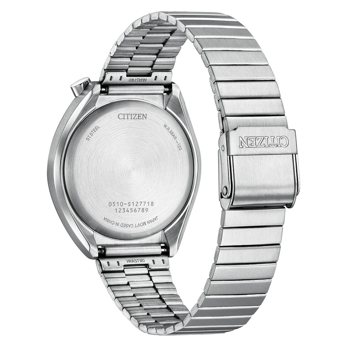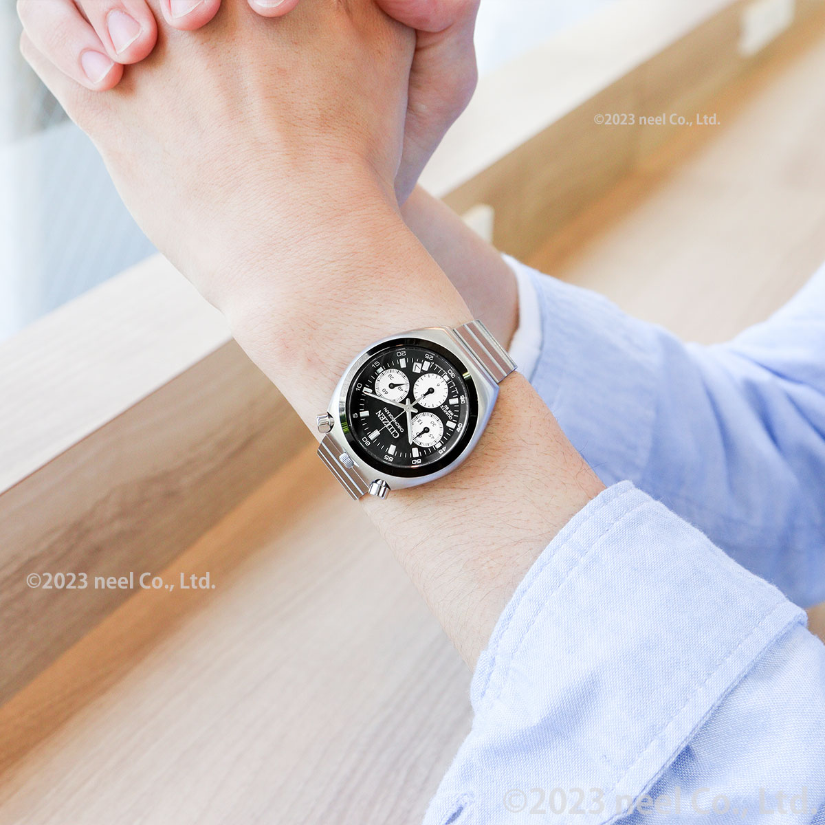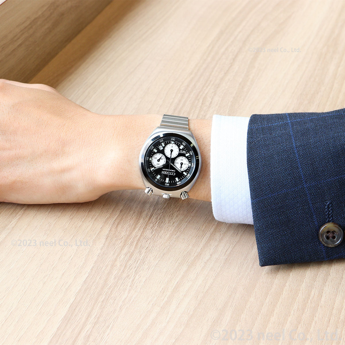 TSUNO CHRONOツノクロノ誕生50周年に新配色を追加。シチズン初の本格クロノグラフ機能付き時計として1973年に登場した「クロノグラフ チャレンジタイマー」のデザインを復刻。ケースの12時側に配置されたプッシュボタンがツノのように見えることから「ツノクロノ」の愛称で呼ばれてきたアイコンモデルに新配色を追加。やわらかなケース形状とシャープなベゼルが調和する絶妙なデザインに仕上げ、ケースサイズも38.0mmと手首に心地よく収まり、男女問わず使いやすいサイズ感です。ブラックの文字板ベースとホワイトのサブダイヤルを組み合わせたカラーリングで、クールなデザインを好む方におすすめの配色です。