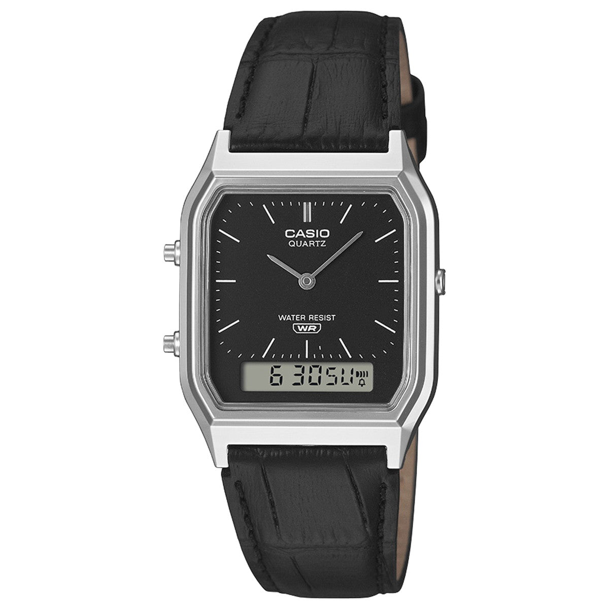 ヴィンテージな装いのアナログ・デジタルコンビネーションモデルです。ベースモデルは角型フェイスにアナログ時計とデジタル表示を組み合わせた人気のAQ-230。日常生活用防水やストップウオッチ、アラーム等、便利な機能も備えています。シルバーケースにはブラックレザーバンドを組み合わせ、モダンで洗練された印象を与えます。バンドはクラシカルな型押しデザインが施されており、細部にまでこだわった高級感を感じさせます。新しいカラーバリエーションで、あなたの腕元に特別な魅力を添えてみませんか。