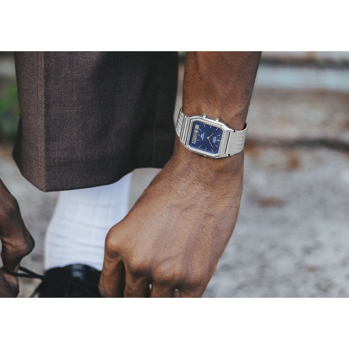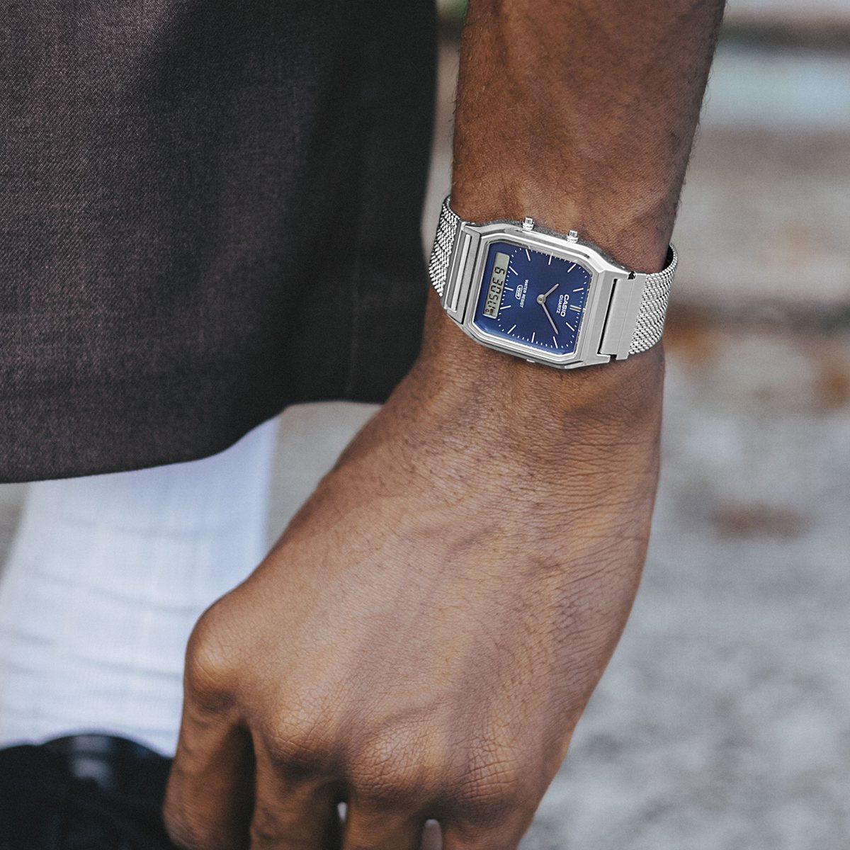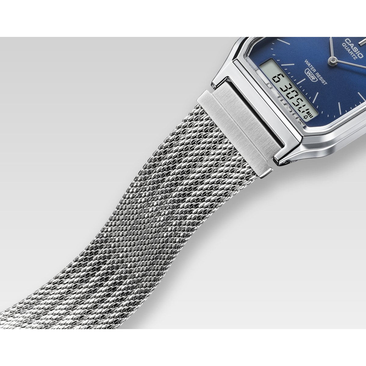 使い勝手の良さで根強い人気を誇るデジタルウオッチ、A158と、角型フェイスにアナログ時計とデジタル表示を組み合わせたAQ230を、メッシュバンド仕様に仕立てたスタイリッシュなウオッチです。メッシュバンドをベースに縦方向にプレスを入れ、立体感のあるデザインを実現しました。腕元に洗練された印象を添えつつ、快適な装着感を実現します。AQ-230のカラーバリエーションは、シルバーケース×ネイビーダイアルとシルバーケース×シルバーダイアルの2種類。クラシカルなデザインに新しいメッシュバンドが加わり、さらに魅力的なスタイルを楽しめます。編み込まれた金属の美しさが、スタイルに存在感を添えるウオッチです。