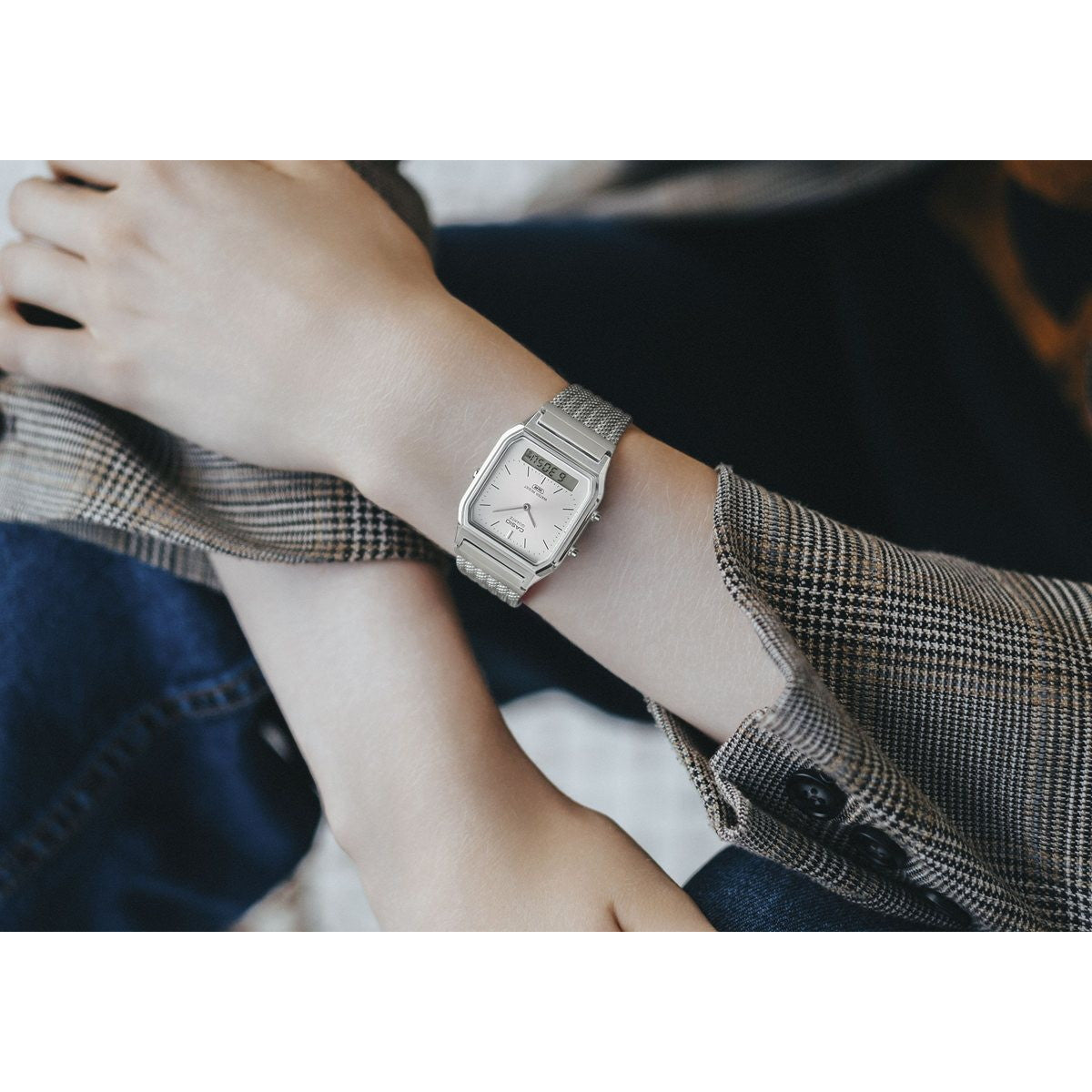 使い勝手の良さで根強い人気を誇るデジタルウオッチ、A158と、角型フェイスにアナログ時計とデジタル表示を組み合わせたAQ230を、メッシュバンド仕様に仕立てたスタイリッシュなウオッチです。メッシュバンドをベースに縦方向にプレスを入れ、立体感のあるデザインを実現しました。腕元に洗練された印象を添えつつ、快適な装着感を実現します。AQ-230のカラーバリエーションは、シルバーケース×ネイビーダイアルとシルバーケース×シルバーダイアルの2種類。クラシカルなデザインに新しいメッシュバンドが加わり、さらに魅力的なスタイルを楽しめます。編み込まれた金属の美しさが、スタイルに存在感を添えるウオッチです。