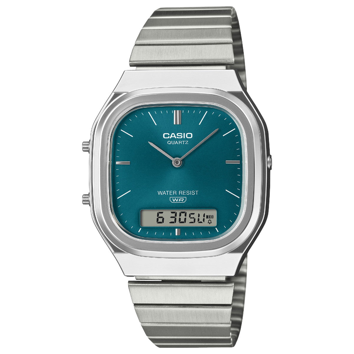 レトロモダンな装いのアナログ・デジタルコンビネーションモデル、AQ-240です。このモデルは、角型フェイスにアナログ時計とデジタル表示を組み合わせたモデルで、丸みのあるケース形状を採用しています。曲線を基調としたデザインが、洗練された印象を与えます。ダイアルには旭光仕上げを施し、上品な光沢感を演出。メタリックインデックスのアクセントで、クラシックとモダンを融合させています。6時位置のデジタル表示も視認性とデザイン性を両立したバランスのよいレイアウトです。カラーバリエーションとして、シルバーケース×グリーンダイアルに加え、シルバーのワントーン、ゴールドのワントーンの3種類をご用意しました。レトロな趣に現代的な美しさをプラスしたAQ-240E/240EGです。