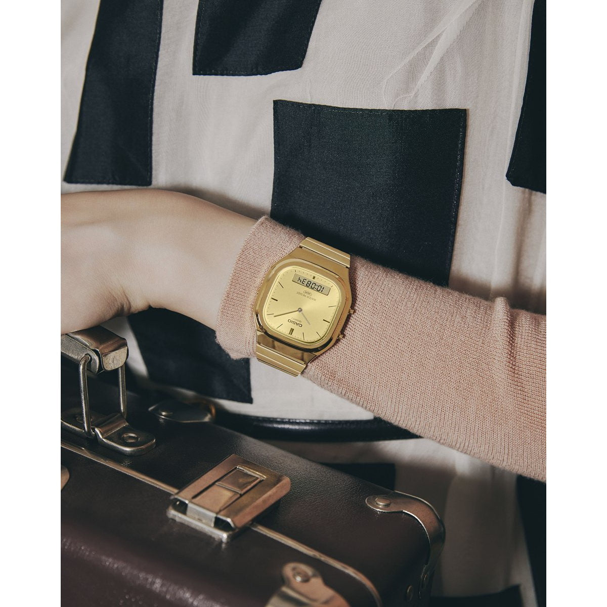 レトロモダンな装いのアナログ・デジタルコンビネーションモデル、AQ-240です。このモデルは、角型フェイスにアナログ時計とデジタル表示を組み合わせたモデルで、丸みのあるケース形状を採用しています。曲線を基調としたデザインが、洗練された印象を与えます。ダイアルには旭光仕上げを施し、上品な光沢感を演出。メタリックインデックスのアクセントで、クラシックとモダンを融合させています。6時位置のデジタル表示も視認性とデザイン性を両立したバランスのよいレイアウトです。カラーバリエーションとして、シルバーケース×グリーンダイアルに加え、シルバーのワントーン、ゴールドのワントーンの3種類をご用意しました。レトロな趣に現代的な美しさをプラスしたAQ-240E/240EGです。