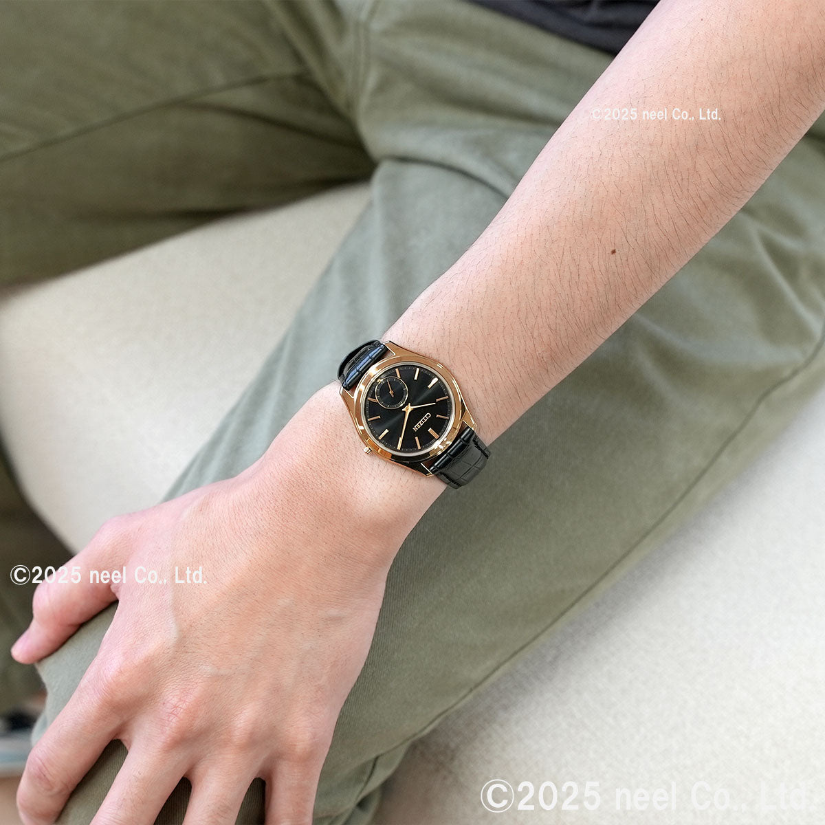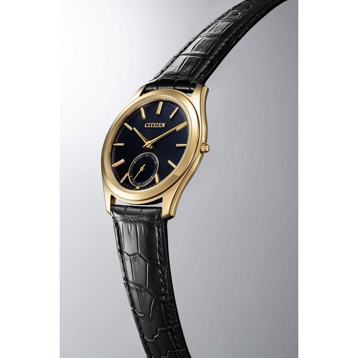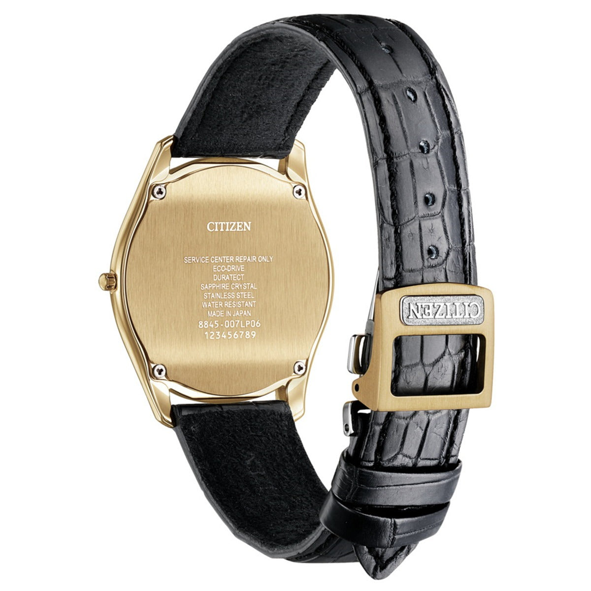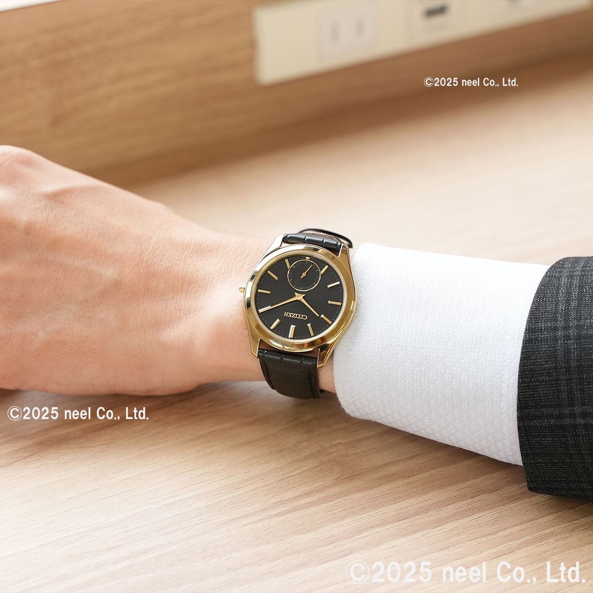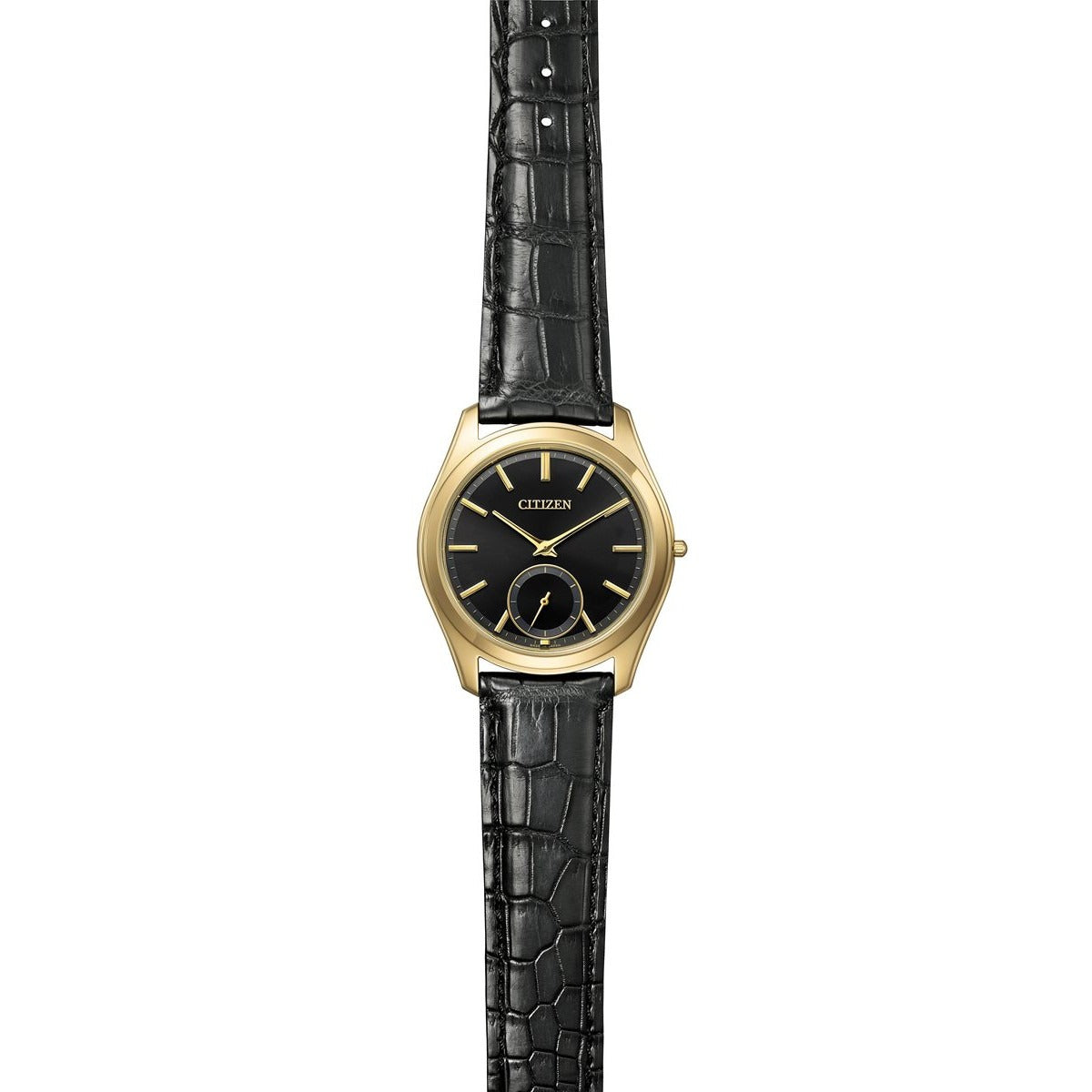 圧倒的な薄さを実現し、美しさと快適な装着感にこだわるドレスウオッチ、シチズン Eco-Drive One(エコ・ドライブ ワン)。艶やかで独創的な雰囲気が、大人の落ち着きある時間を彩るスモールセコンドモデルが登場。ケースには表面硬化技術「デュラテクト」の新色アンバーイエローを採用。様々なスタイルにフィットする落ち着きある輝きを湛えたゴールドカラーが特徴です。文字板は、艶やかでシックなブラックに、金色の針とインデックスが上品かつエレガンスな印象を与えます。無駄を削ぎ落とした薄型フォルムとの調和を追求し、インデックスは短くするなど、ミニマルな要素にまとめました。