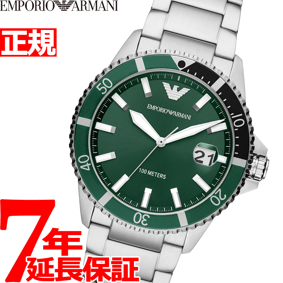 42mm径のケースに三針ムーブメントを搭載した、Emporio Armaniのウォッチ。シルバートーンのバーインデックスと日付ウィンドウを配したグリーンのサンレイダイヤルに、タキメータートップリングとステンレススチールブレスレットを組み合わせました。