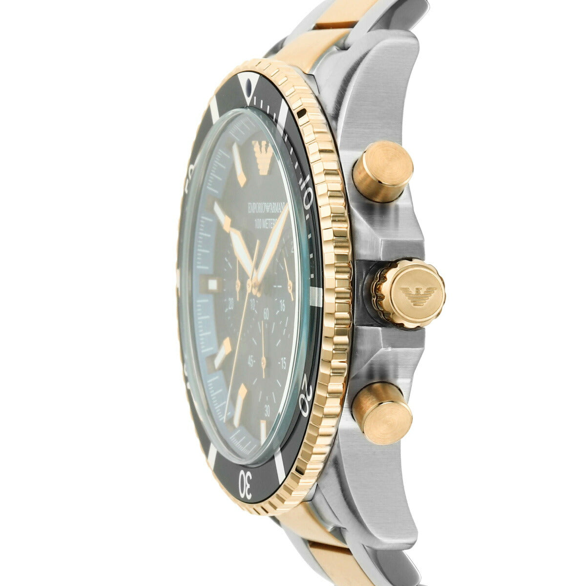 43mm径のケースにクロノグラフムーブメントを搭載したEmporio ArmaniのWORLD EXPLORERウォッチ。CD仕上げを施したブルーのサンレイダイヤルに、蓄光バーインデックスとツートーンのステンレススチールブレスレットを組み合わせました。