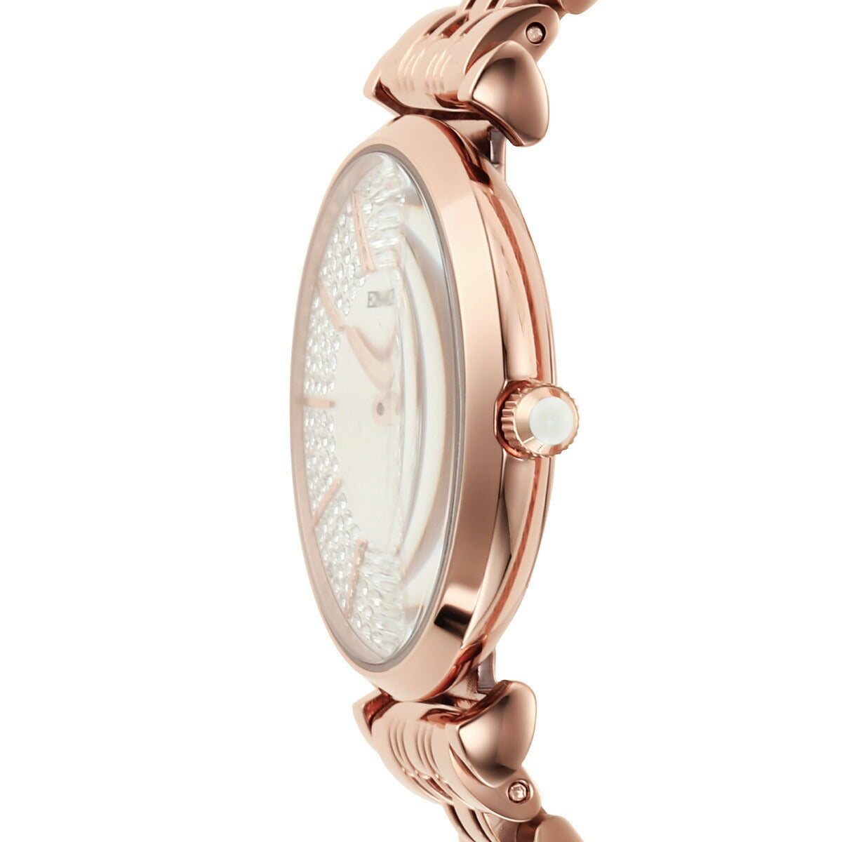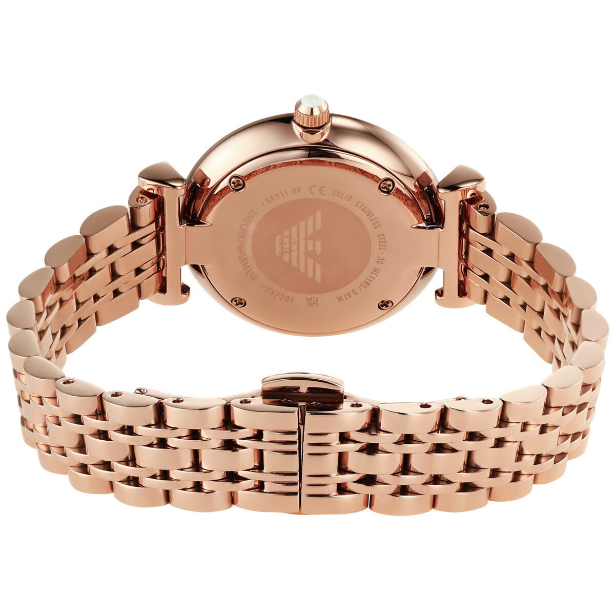 32mm径のケースに二針ムーブメントを搭載したEmporio Armaniのウォッチ。シルバートーンのサンレイダイヤルに、ローズゴールドトーンのステンレススチールブレスレットを組み合わせました。