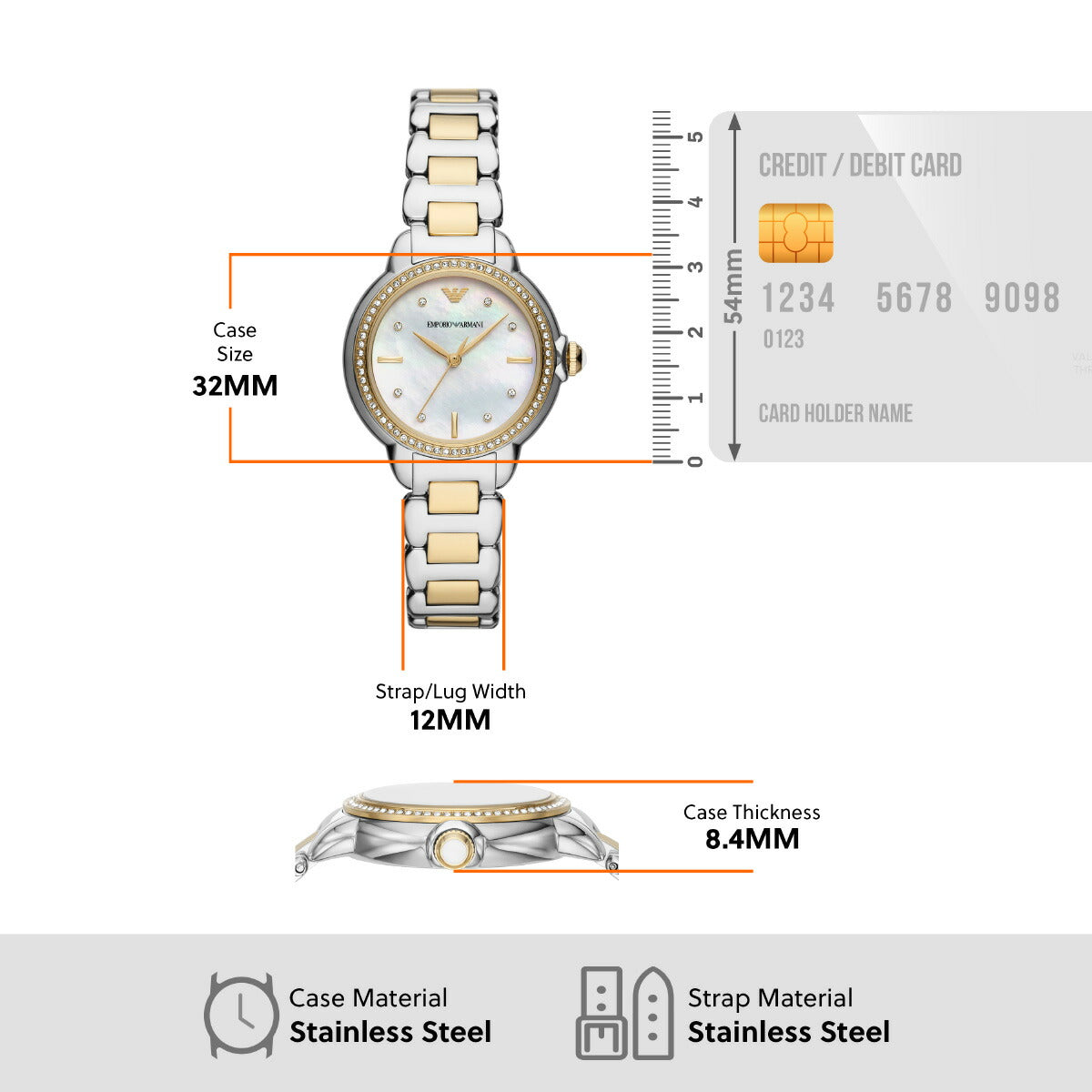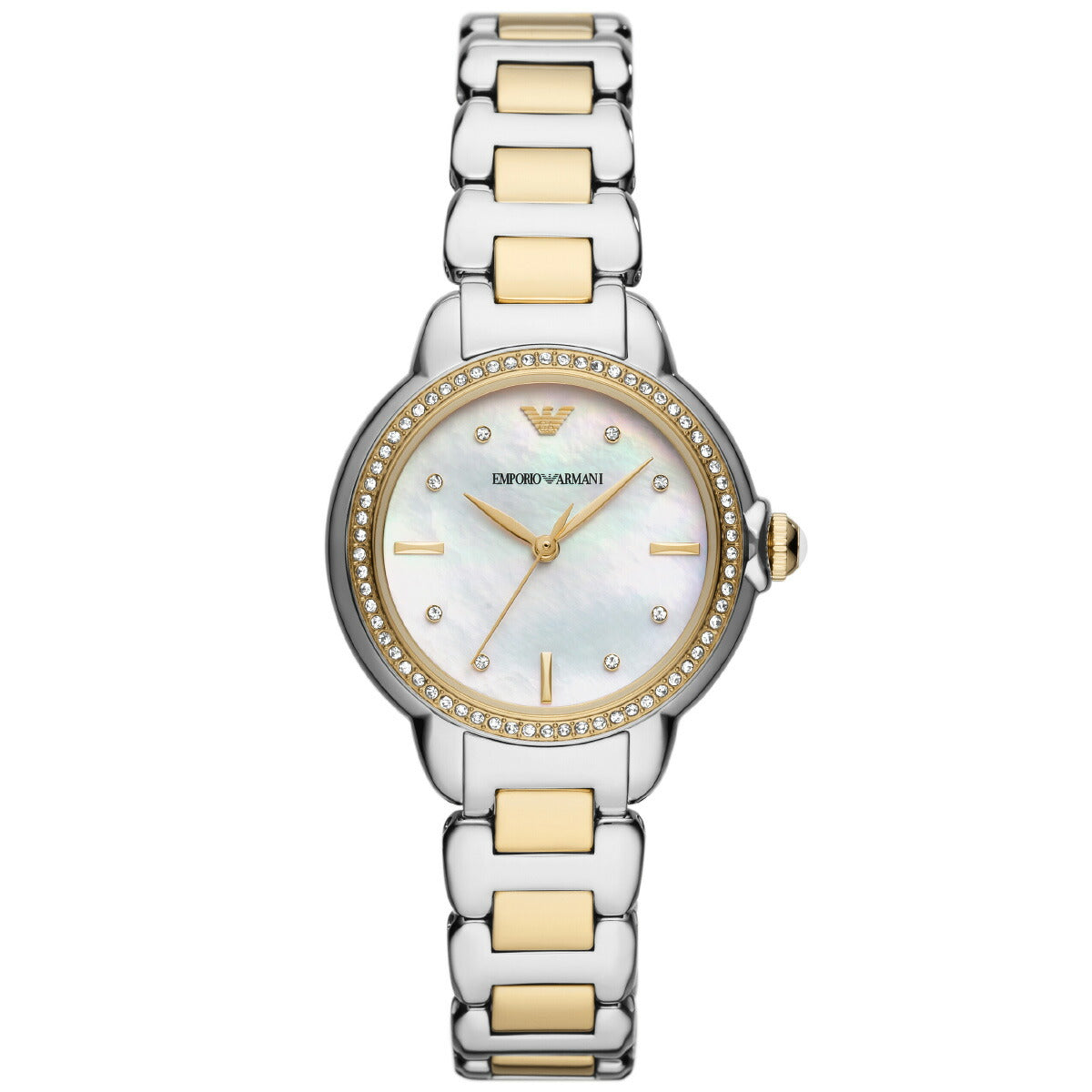 ステンレススチールを使用した32mm径ケースに、三針ムーブメントを搭載したEmporio Armaniのウォッチ。ホワイトマザーオブパールのダイヤルにツートーンのステンレススチールブレスレットを組み合わせました。
