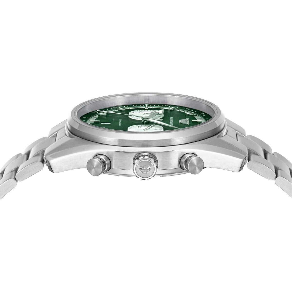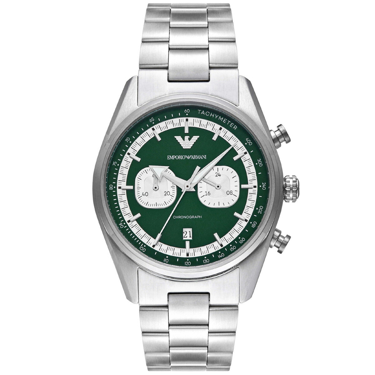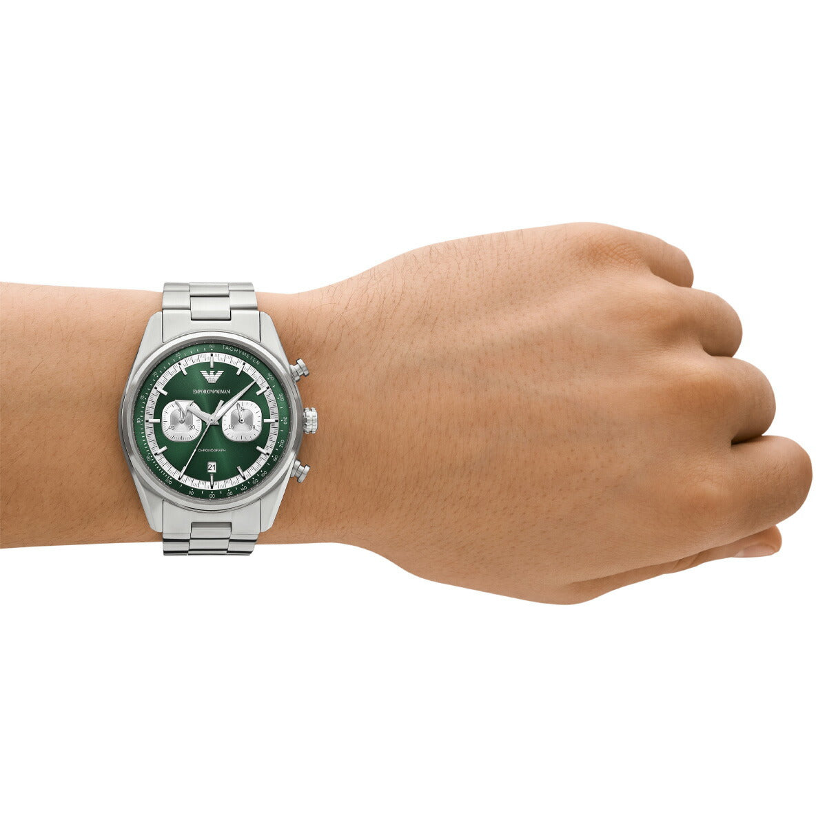 42mm径のケースにクロノグラフムーブメントを搭載したEmporio Armaniのウォッチ。グリーンのサンレイダイヤルに、CD仕上げを施したシルバートーンのサブアイとステンレススチールブレスレットを組み合わせました。