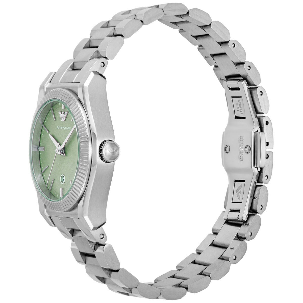 32mm径のケースにデイト表示付き三針ムーブメントを搭載した、Emporio Armaniのウォッチ。印象的なミントグリーンのサンレイダイヤルに、ステンレススチールブレスレットを組み合わせました。溝付きのステンレススチールベゼルが視覚的な魅力をプラスし、かっちりとしたウォッチケースやブレスレットを引き立てています。