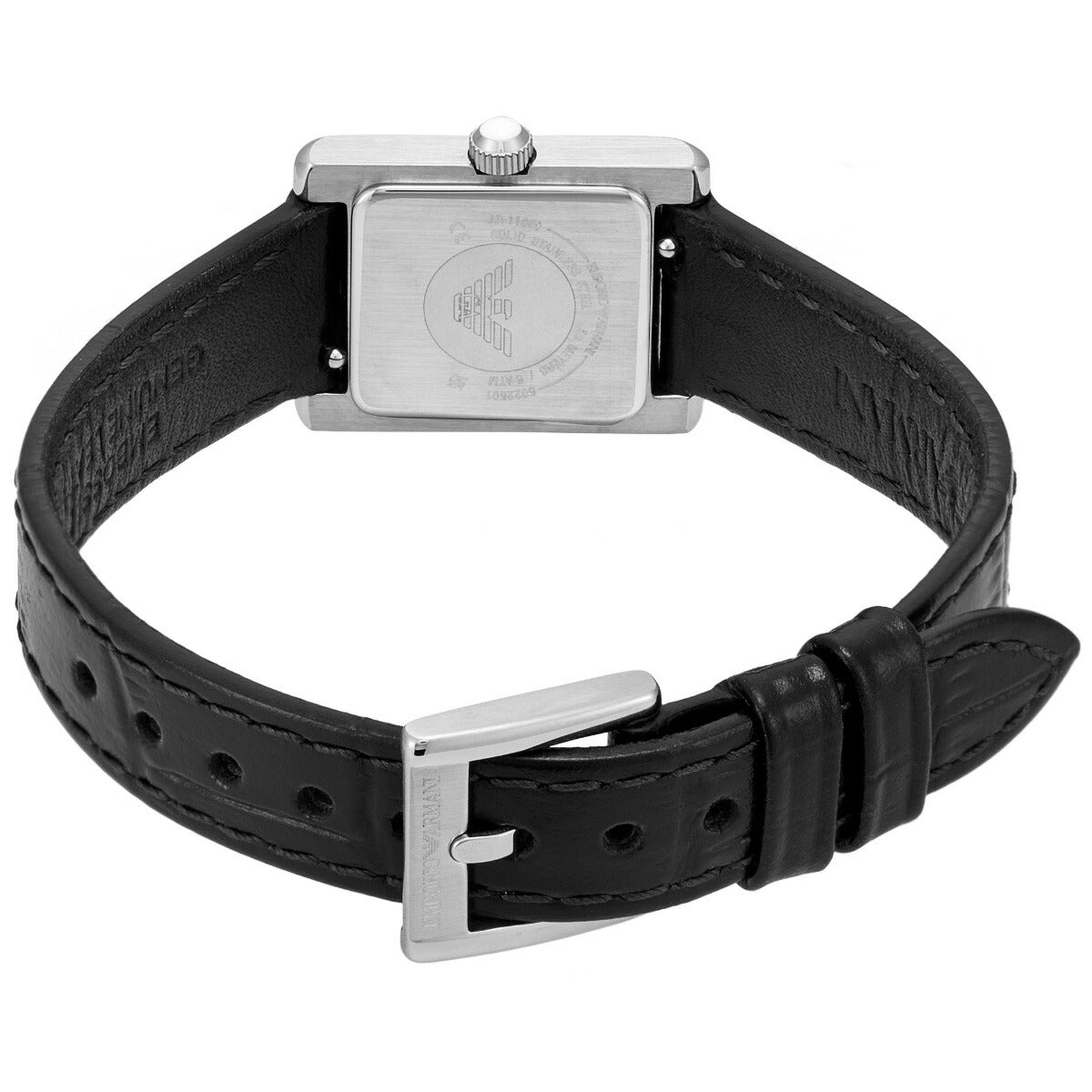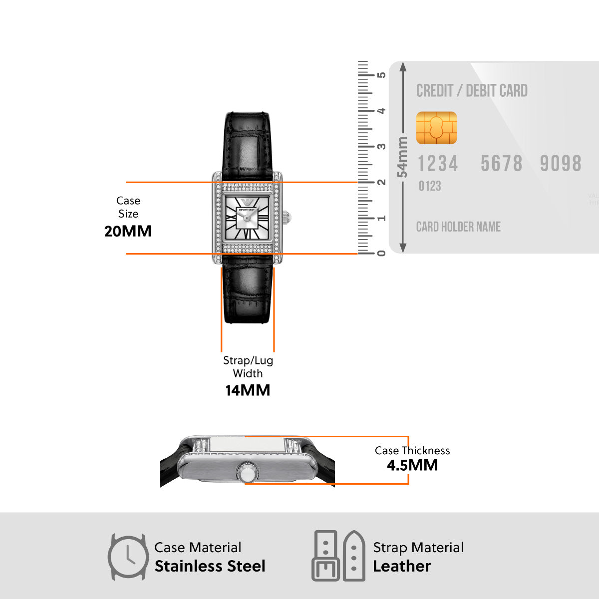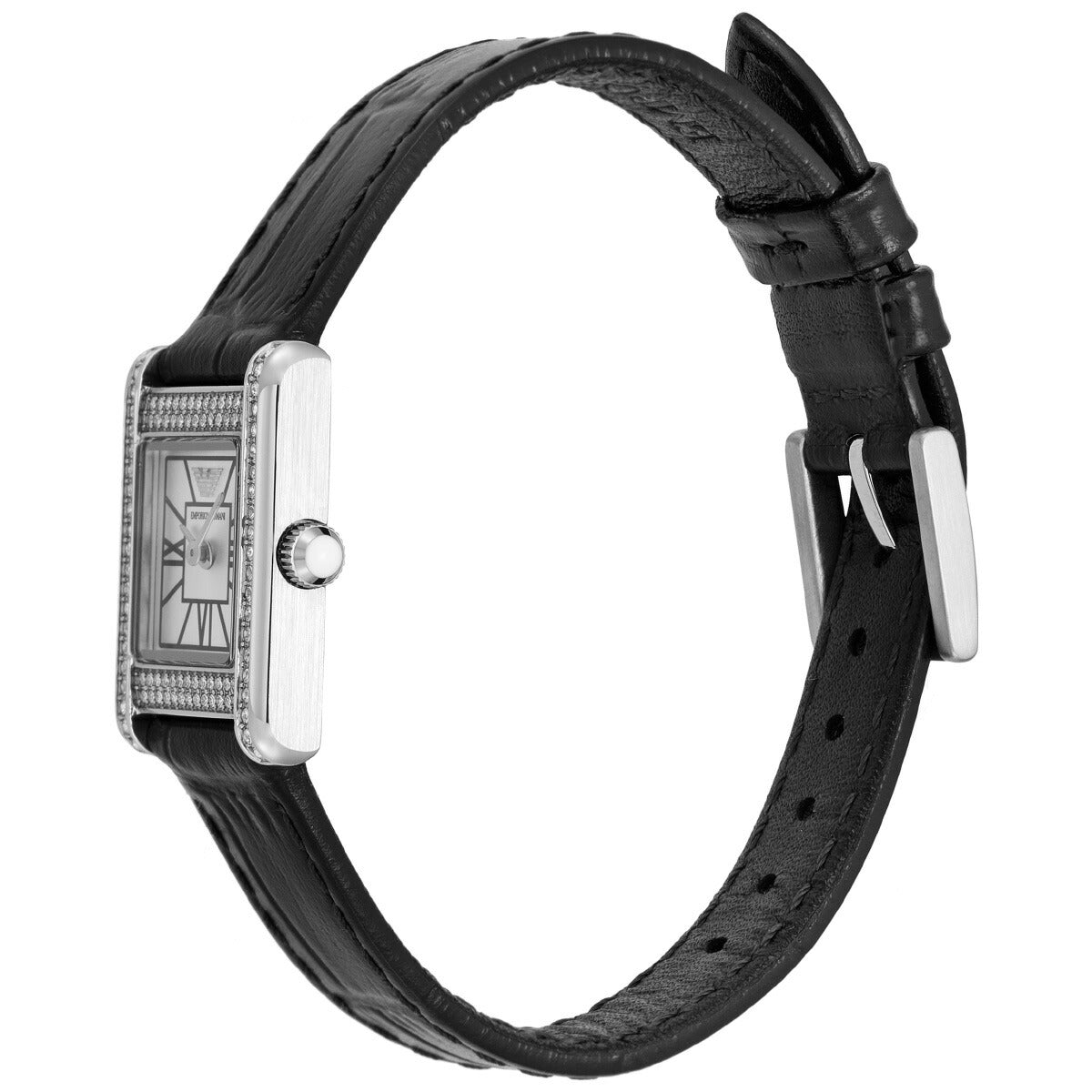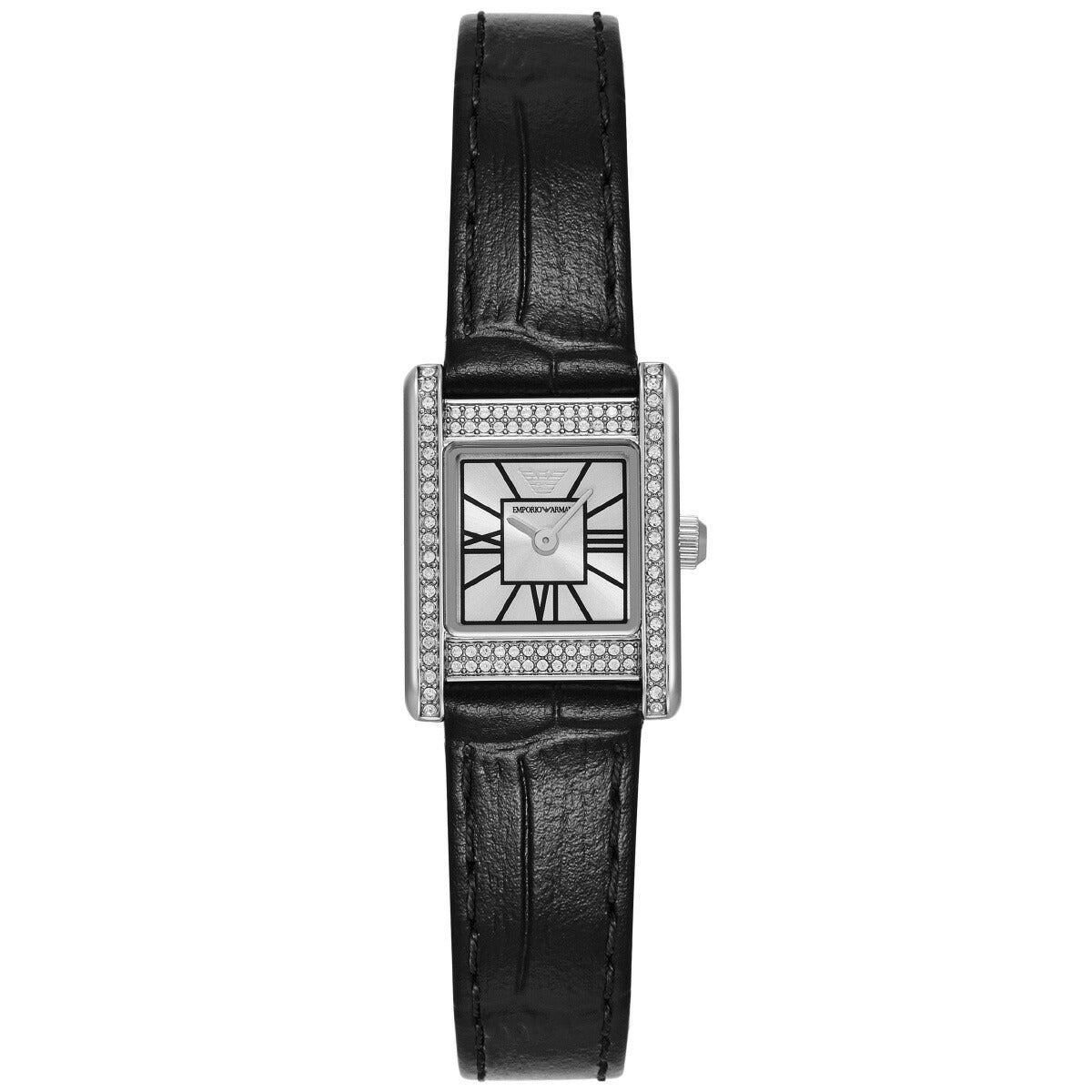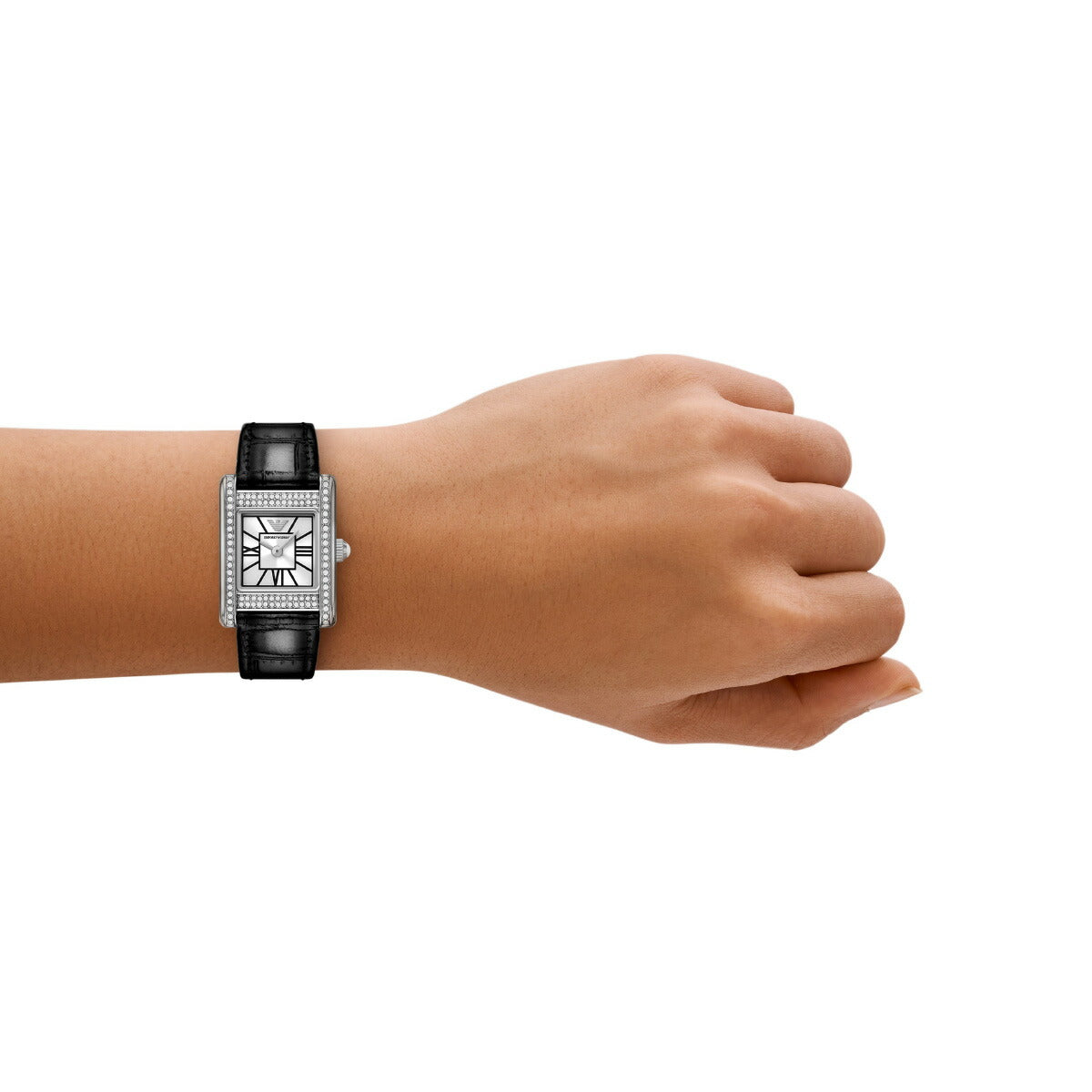 クリスタル装飾を施した20x26mmのステンレススチールケースが輝くEmporio Armaniのウォッチ。ローマ数字インデックスを配したシルバートーンのサンレイダイヤルを組み合わせ、繊細で洗練された魅力を演出しています。二針ムーブメントを搭載し、ひときわ目を引くブラックのレザーストラップを配したこちらのウォッチは、あらゆるシーンで活躍するアクセサリーです。