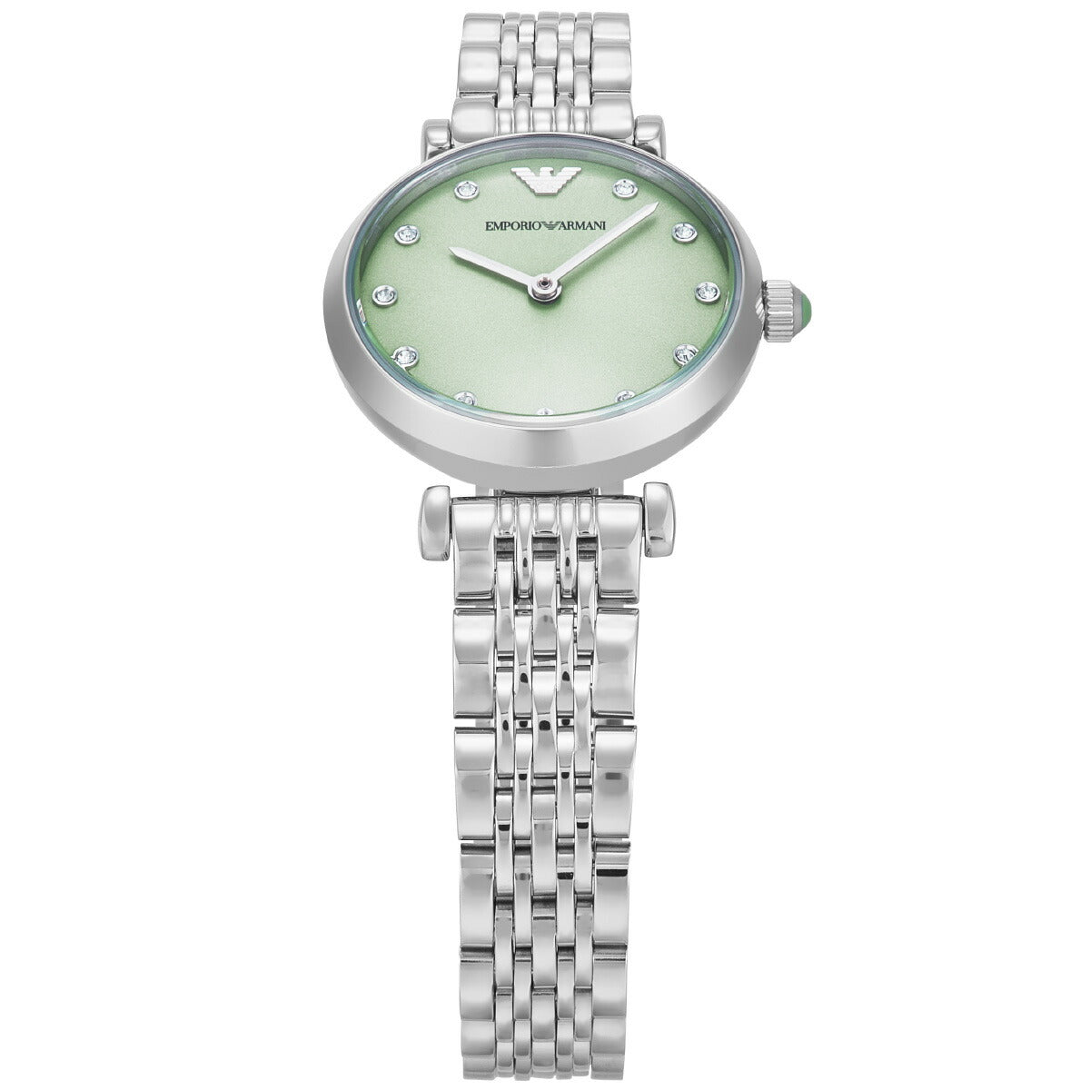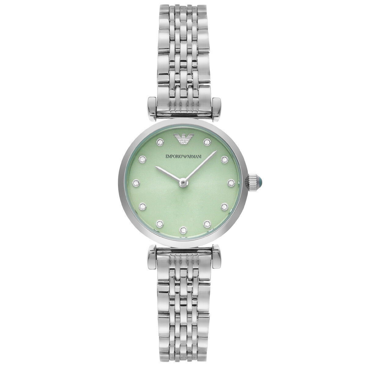 28mm径のケースに二針ムーブメントを搭載した、Emporio Armaniのステンレススチールウォッチ。グリーンのサンレイダイヤルに、小さなクリスタルのインデックスとステンレススチールブレスレットを組み合わせました。