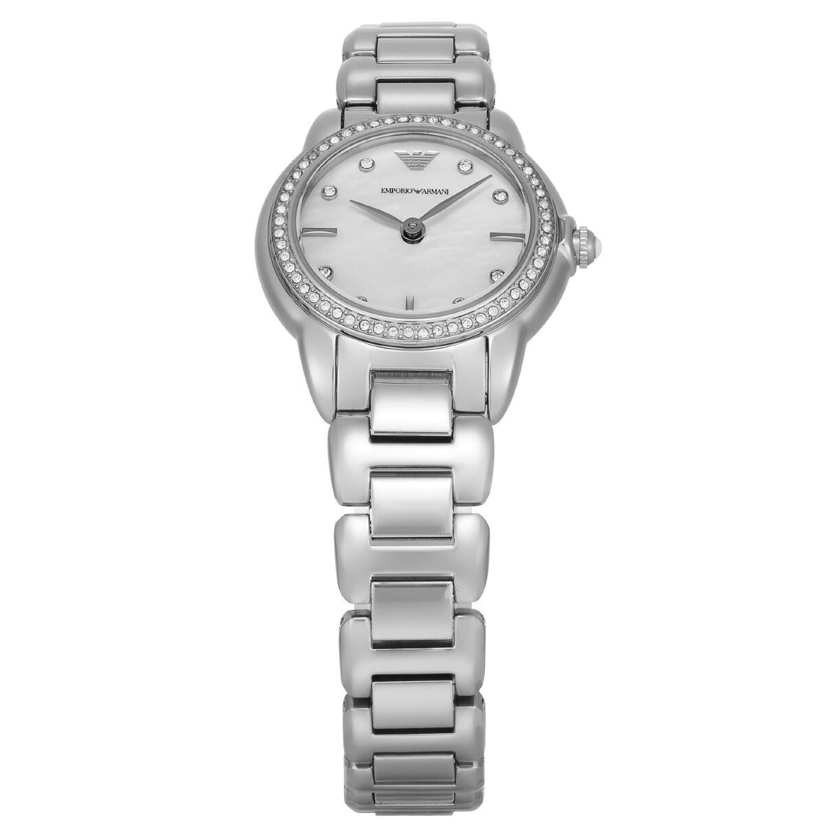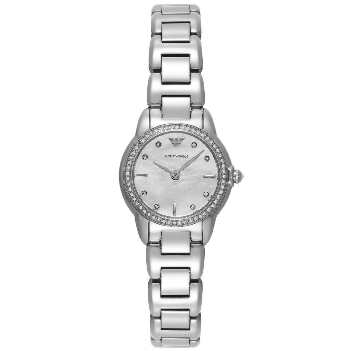 26mm径のラウンドケースに二針クォーツムーブメントを搭載した、Emporio Armaniのプチステンレススチールウォッチ。光沢のあるホワイトマザーオブパールのダイヤルを組み合わせました。スリークなステンレススチールブレスレットを備え、あらゆるシーンの装いを美しく引き立てます。