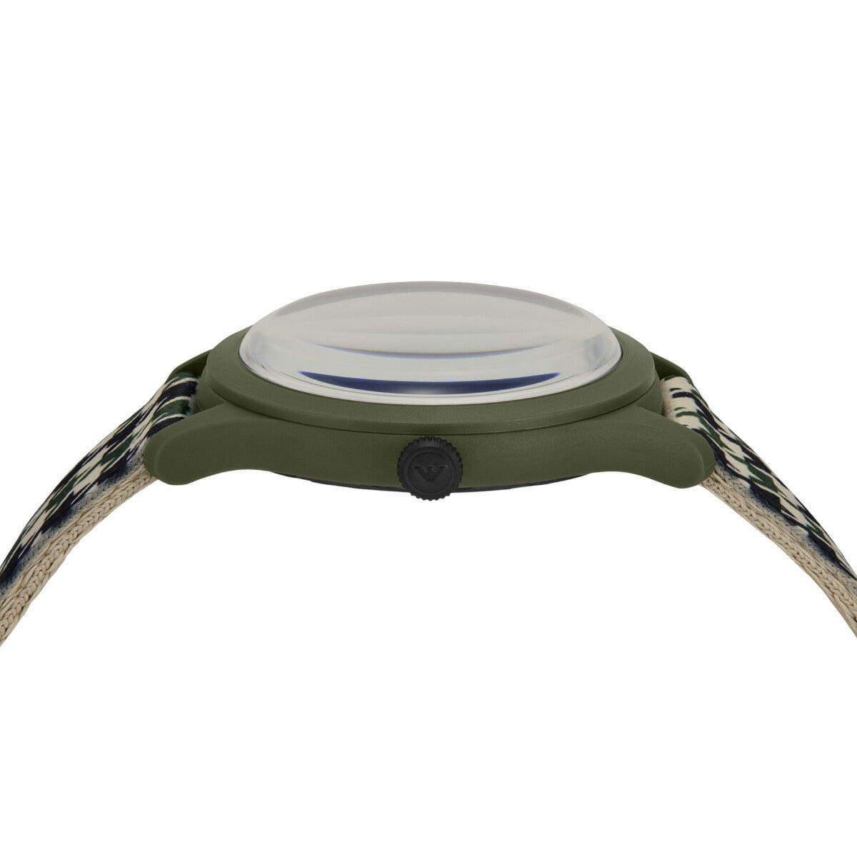 Emporio Armaniの45mm径ウォッチ。海に流れ込むおそれのあるプラスチック廃棄物から作られたリサイクル素材、#tide ocean materialを使用しています。ダークグリーンのマットな#tide製ケース、ダークグリーンのサンレイダイヤル、3針ムーブメント、トライトーンの#tideファブリックストラップが、このスタイルを究極のステートメントウォッチに仕上げています。
